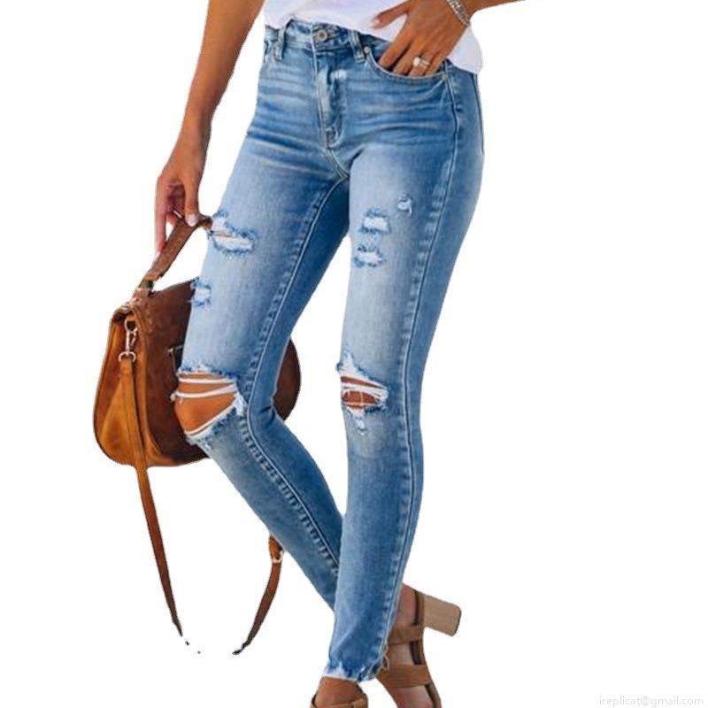 • Women's Slim Fit Ripped Denim Jeans High Waisted Distressed Skinny Pants with Frayed Hem Casual Streetwear Light Blue Cotton Blend Long Trousers