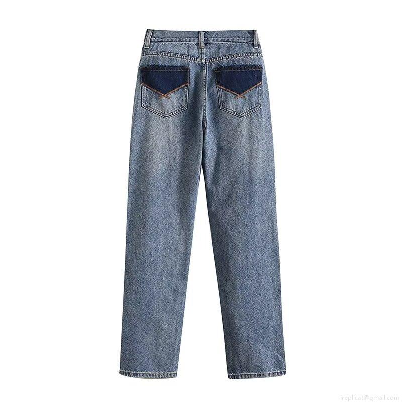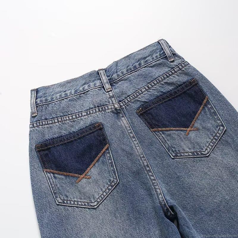 Women's Straight Leg Jeans Denim Pants With Contrast Pockets High Waist Streetwear Casual Washed Blue Trousers For Women