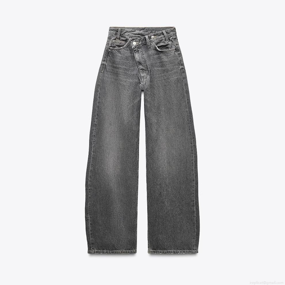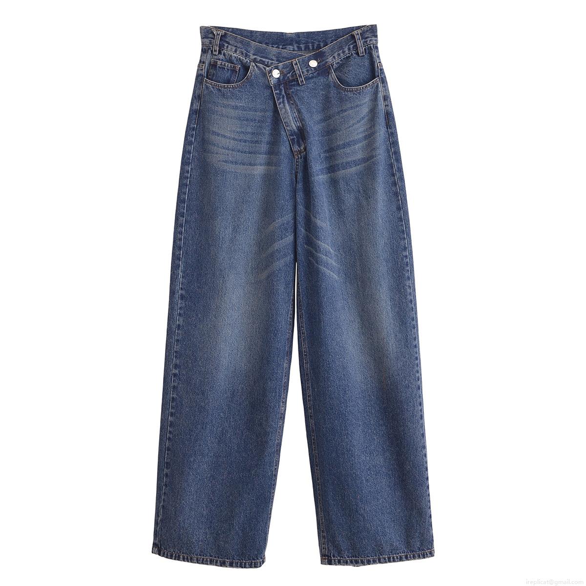 • Women's Vintage High Waisted Wide Leg Jeans Asymmetric Crossover Waist Cotton Denim Washed Loose Straight Trousers Streetwear For Ladies