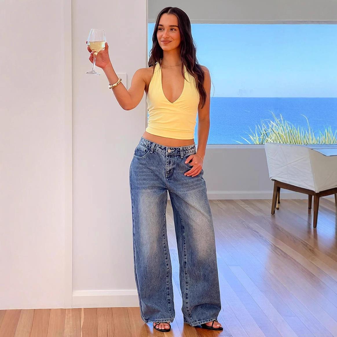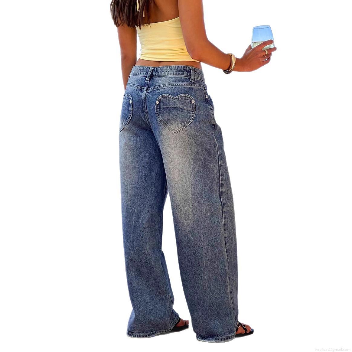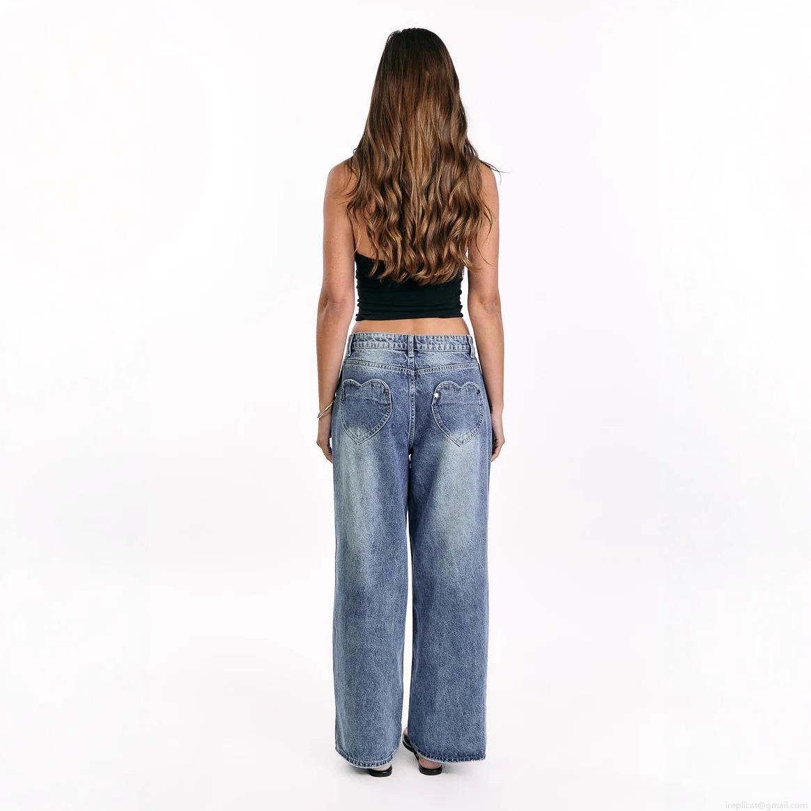 • Women's Vintage Washed Cotton Blend Denim Wide Leg Jeans Featuring Heart Shaped Back Pockets Loose Fit High Waist Streetwear Long Pants For Women Casual Daily Vacation
