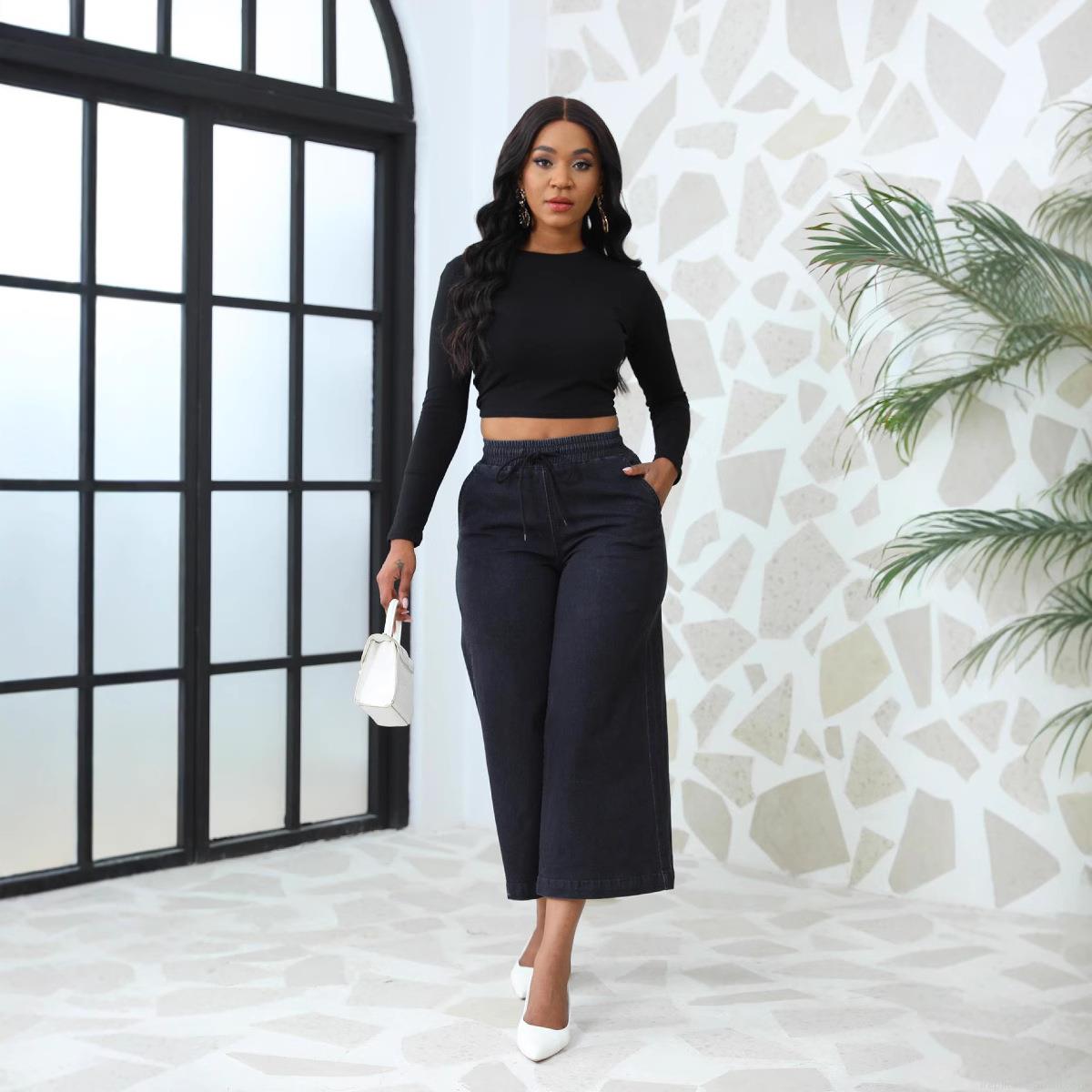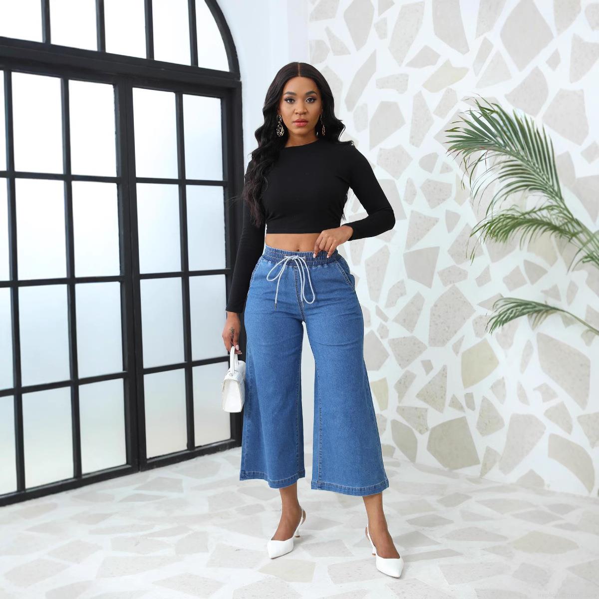 • Women's Wide Leg Denim Jeans High Waist Drawstring Elastic Waistband Loose Cropped Nine-Point Pants Casual Washed Cotton Blend Trousers For Lady