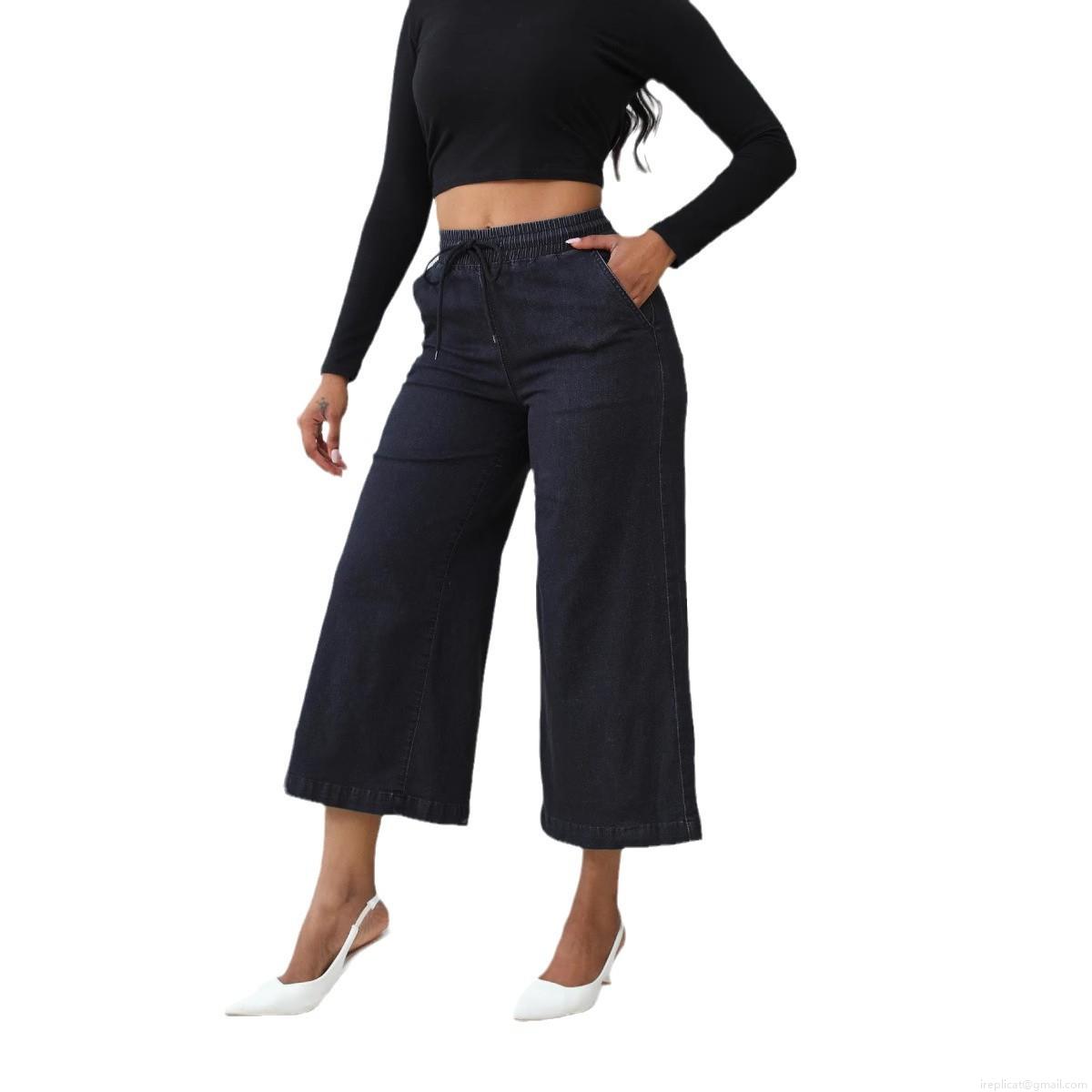 Women's Wide Leg Denim Jeans High Waist Drawstring Elastic Waistband Loose Cropped Nine-Point Pants Casual Washed Cotton Blend Trousers For Lady