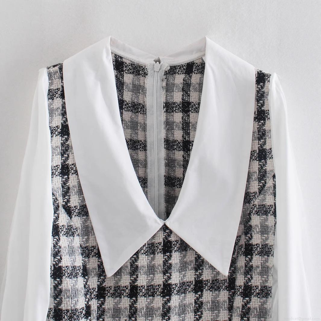 Tassel, Checkered Pattern, Color Blocking, Glossy Silk, Peter Pan's Leader, Puff Sleeves