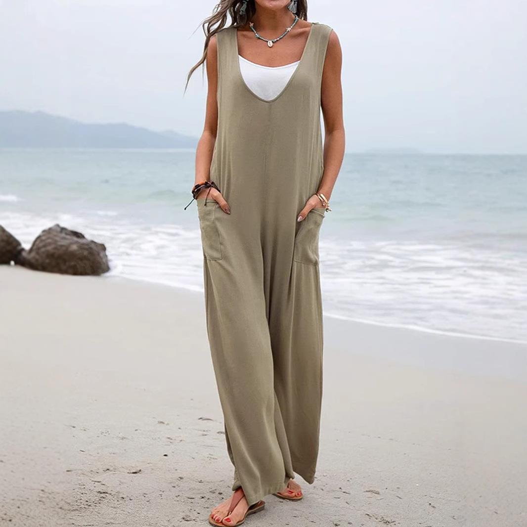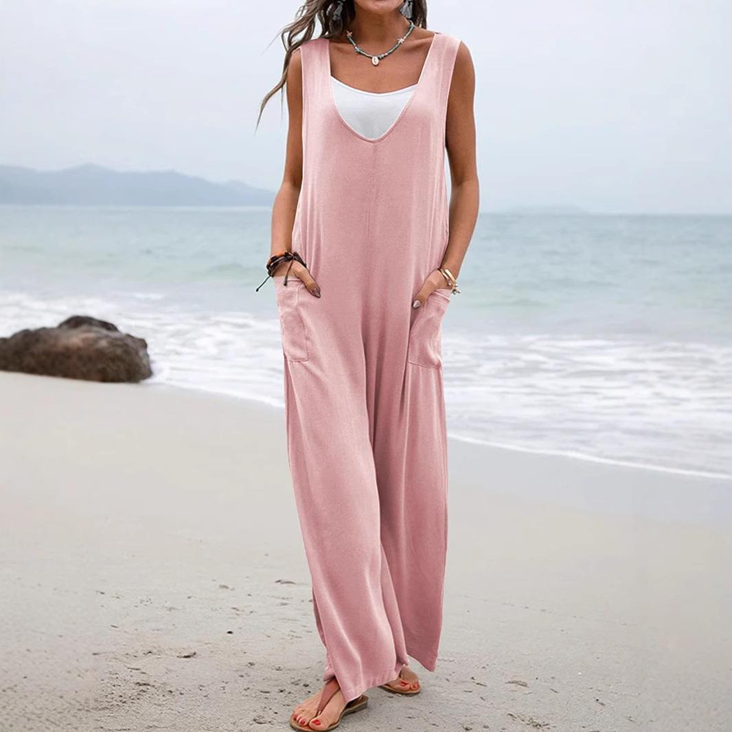 • Women's Casual Sleeveless V-Neck Jumpsuit Cotton Blend Wide Leg Romper With Pockets Summer Beach Vacation Solid Color Loose Overalls