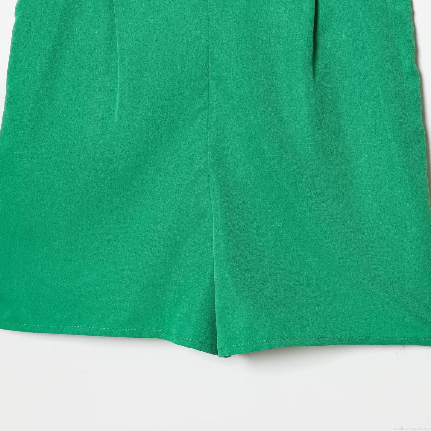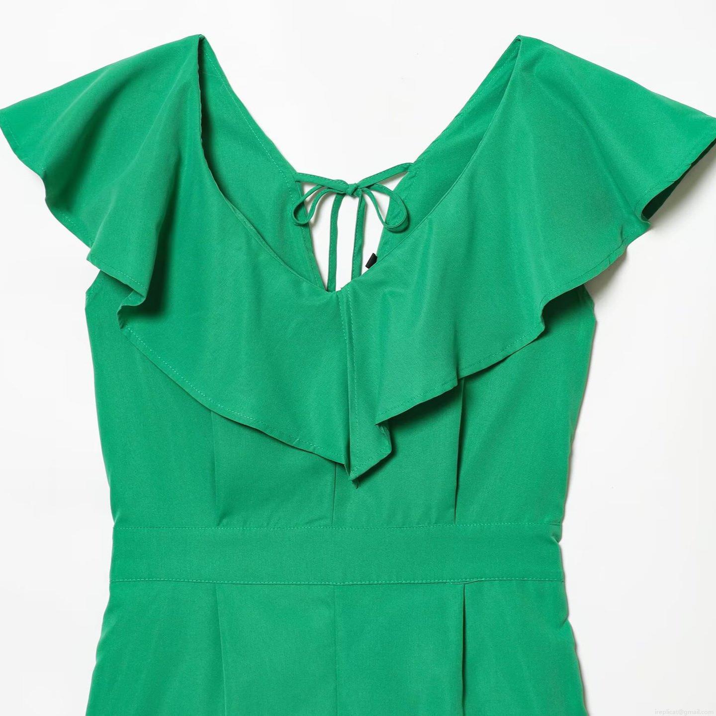 • Women's Chic Green Ruffled V-Neck Romper 100% Polyester Sleeveless Jumpsuit With Back Tie And Elastic Waist Summer Fashion Short One-Piece For Women