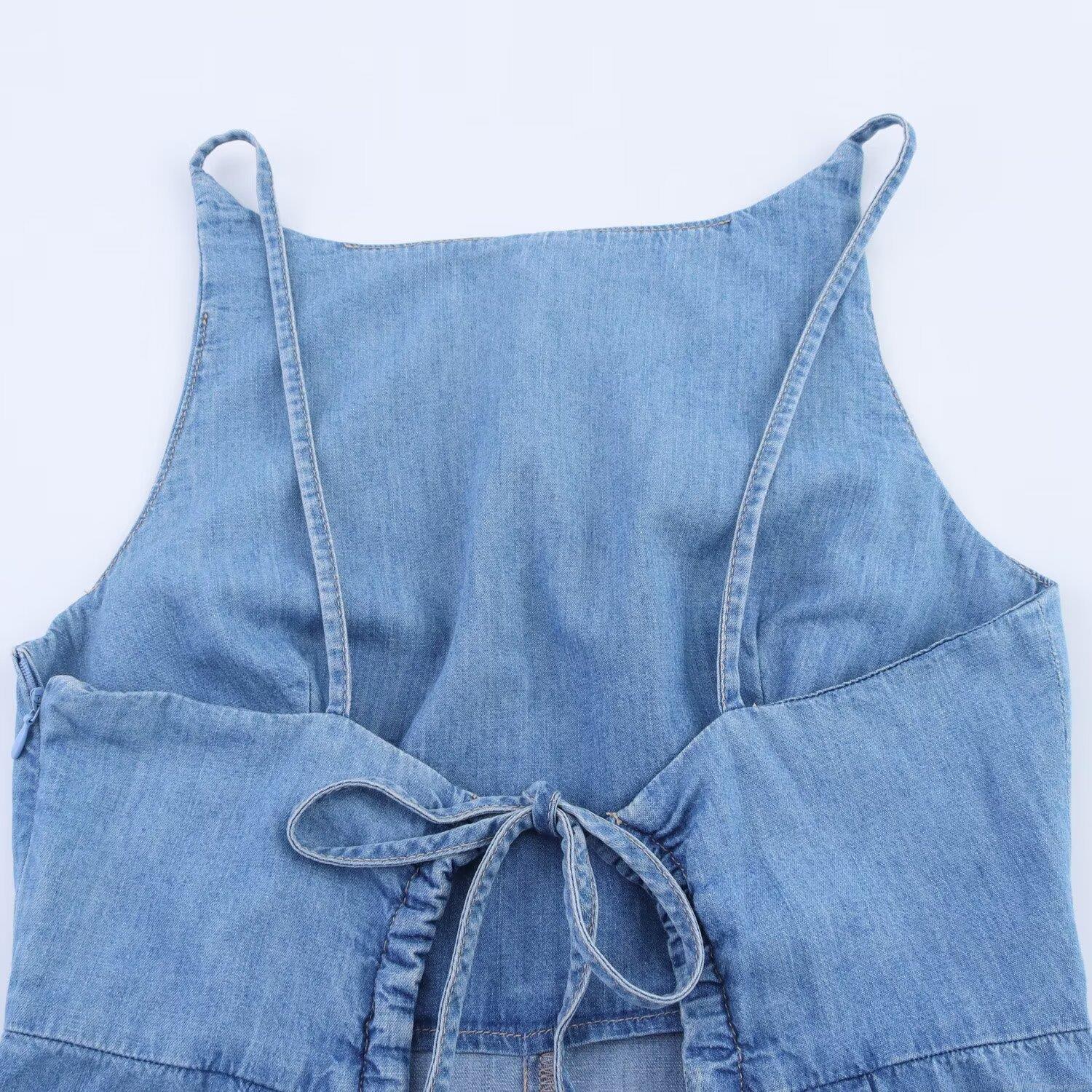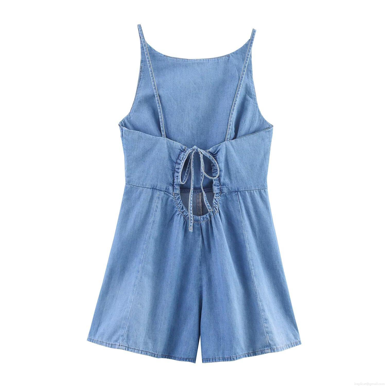 • Women's Sexy Backless Denim Romper Sleeveless Tie Back Low Waist Straight Leg Mini Jumpsuit Washed Denim Streetwear Short Bodysuit For Summer
