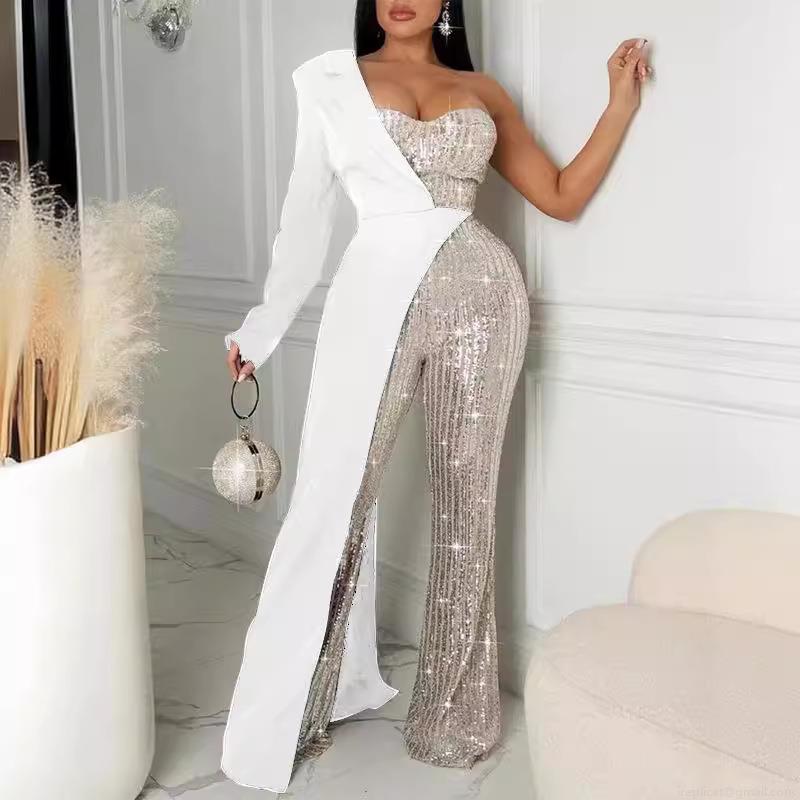 Sequin, One Shoulder, Asymmetric, Color Blocking, Wide-leg, Suit Collar