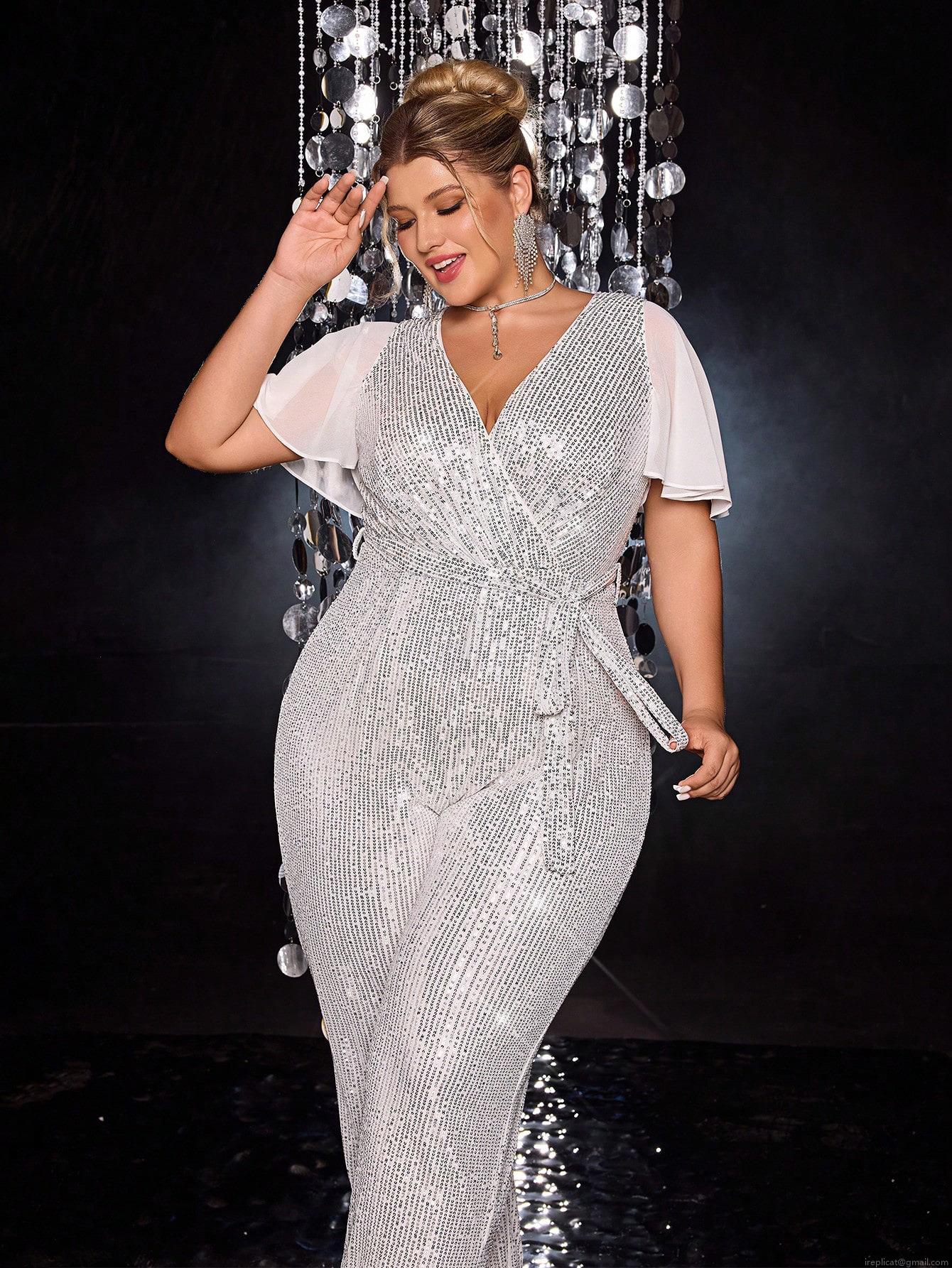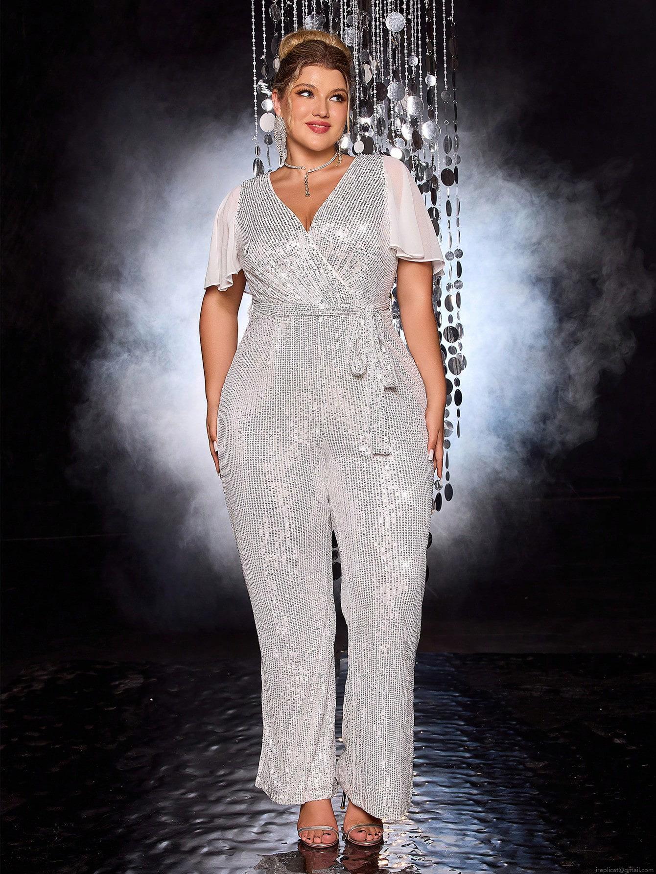 • Plus Size Women's Sequin Jumpsuit Elegant V Neck Mesh Patchwork Half Sleeve Flare Sleeve High Waist Wide Leg Bodysuit Party Evening Clubwear White Silver Long Pants
