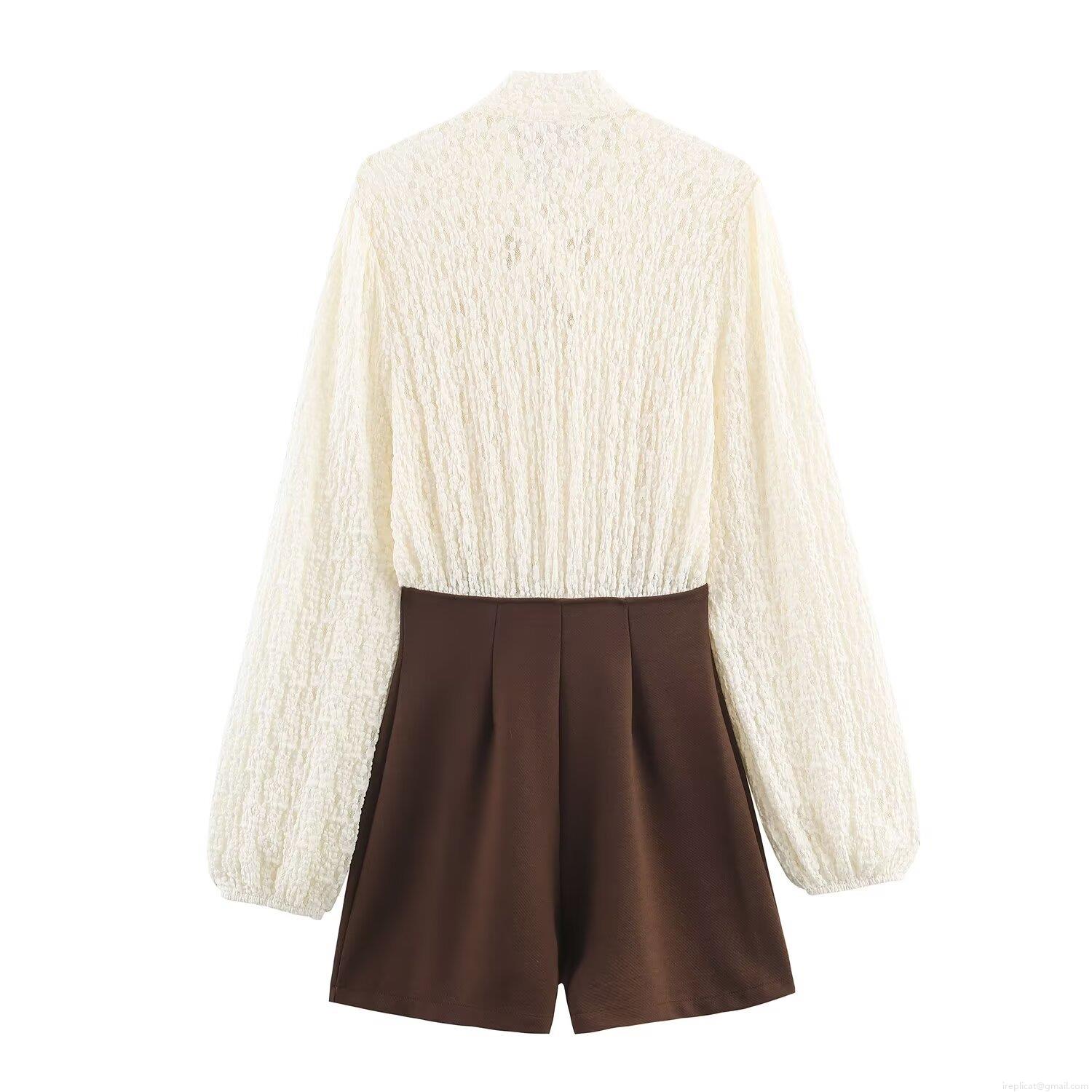 • Women Elegant Lace Polyester Splicing Jumpsuit Bow Tie Neck Lantern Sleeve Contrast Color Hollow Out Short Romper for Party Date