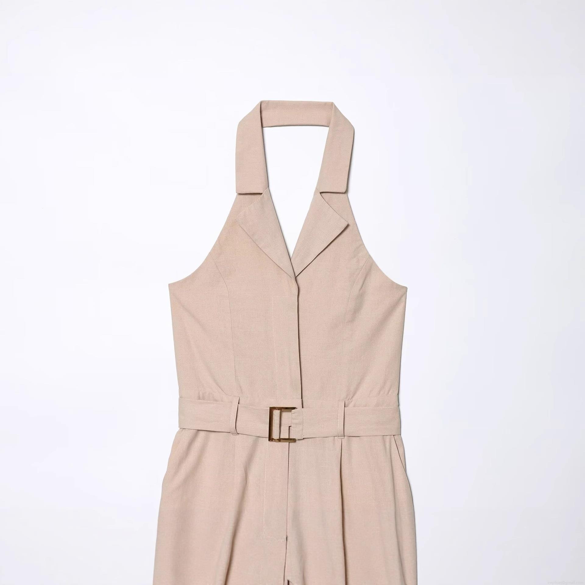 • Women Halter Neck Backless Jumpsuit With Belt Elegant Notched Lapel Wide Leg Cotton Blend Sleeveless One Piece Long Pant Romper