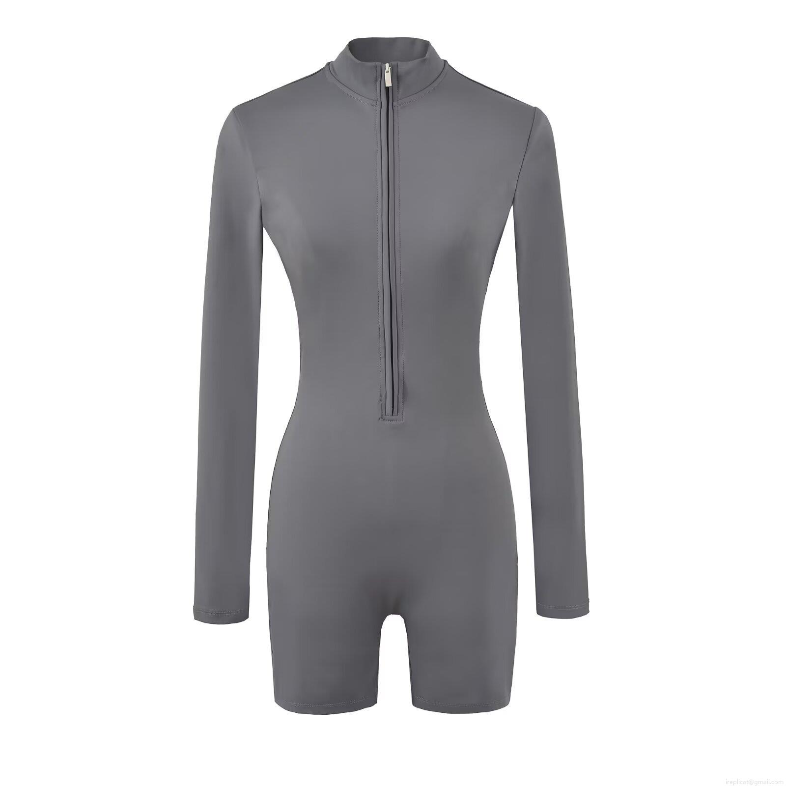 Women Long Sleeve Slim Fit Half Zip Up Romper One Piece Fitness Yoga Jumpsuit High Elastic Stand Collar Solid Short Jumpsuits For Workout Casual Streetwear