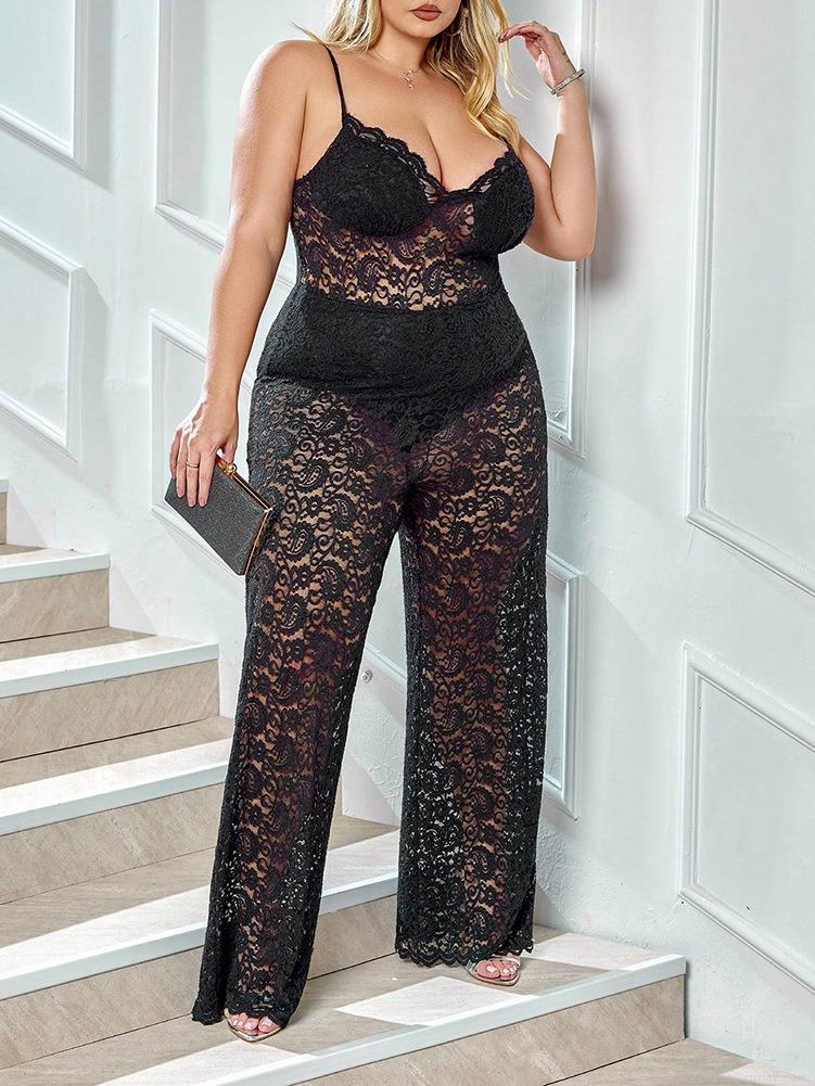 • Women Plus Size Lace Hollow Out Jumpsuit Sexy Deep V Sleeveless Straight Leg Romper Party Clubwear Casual Black Long Jumpsuits