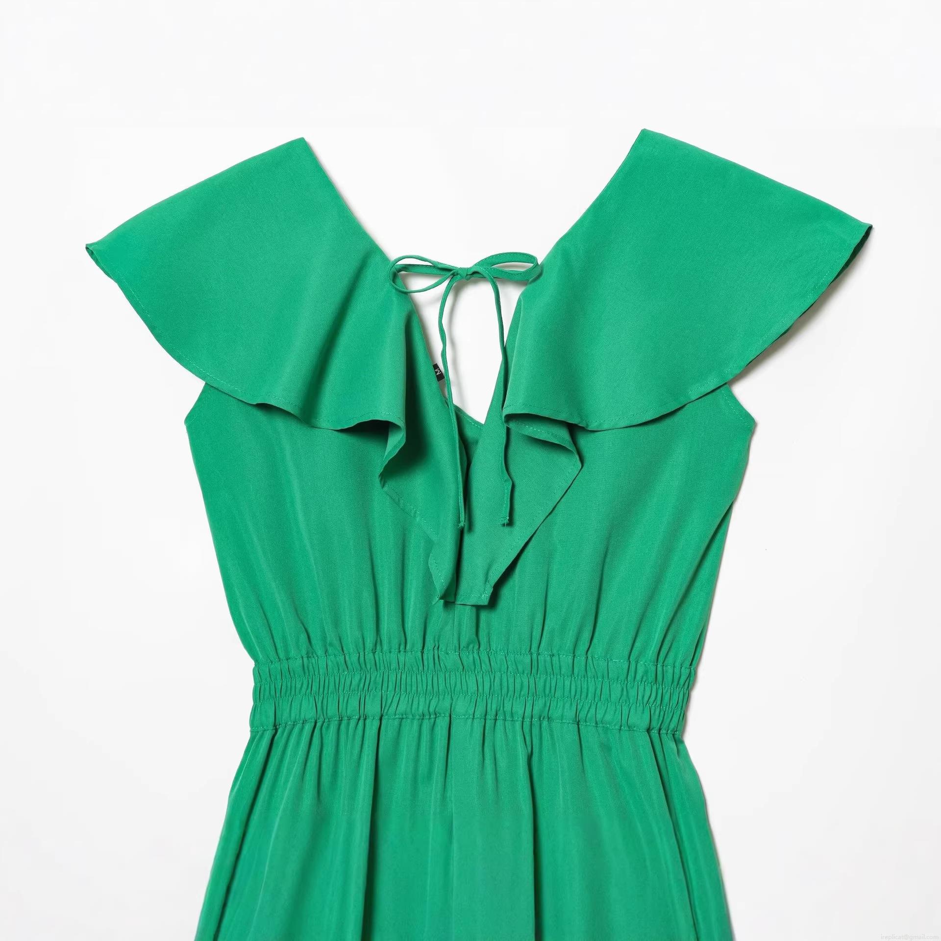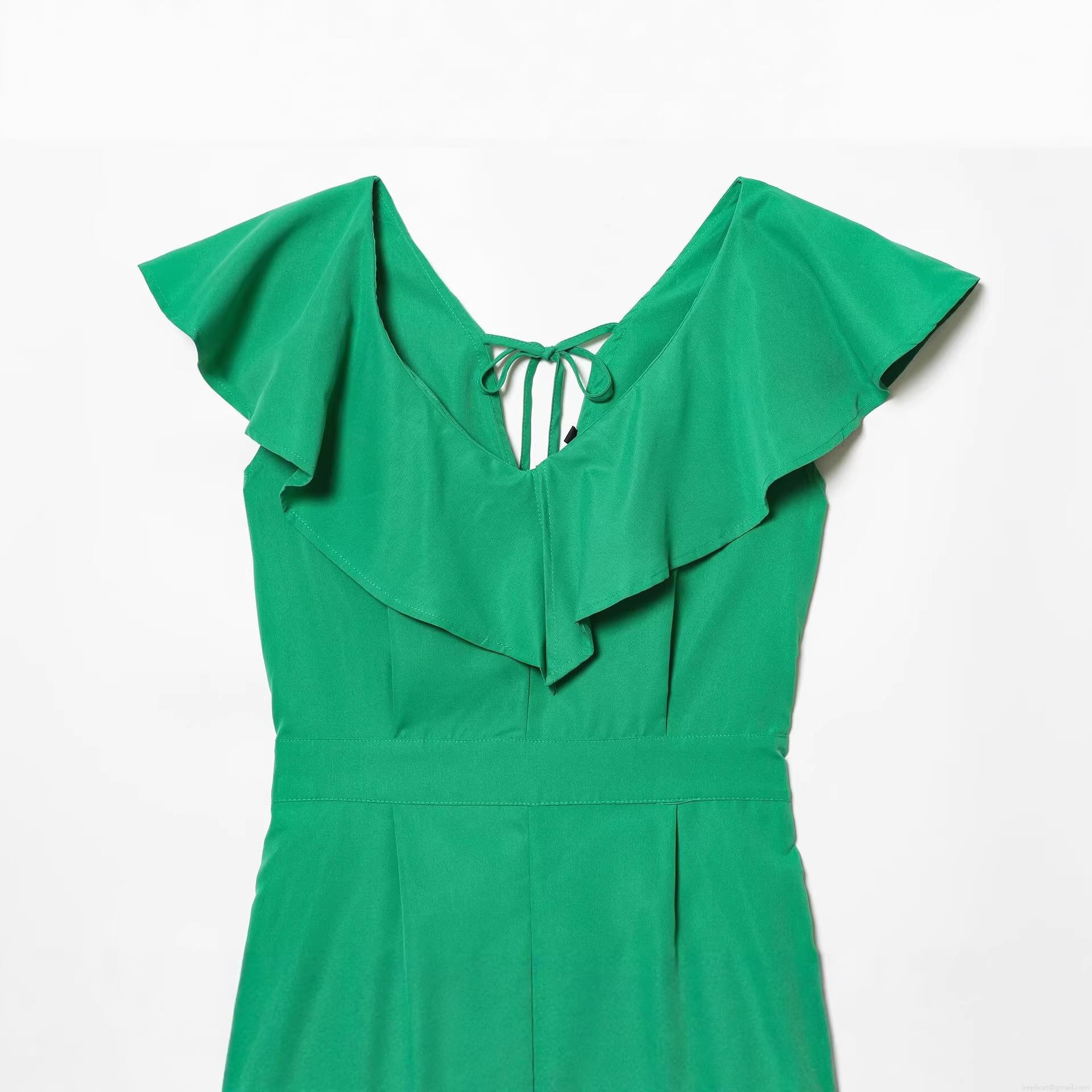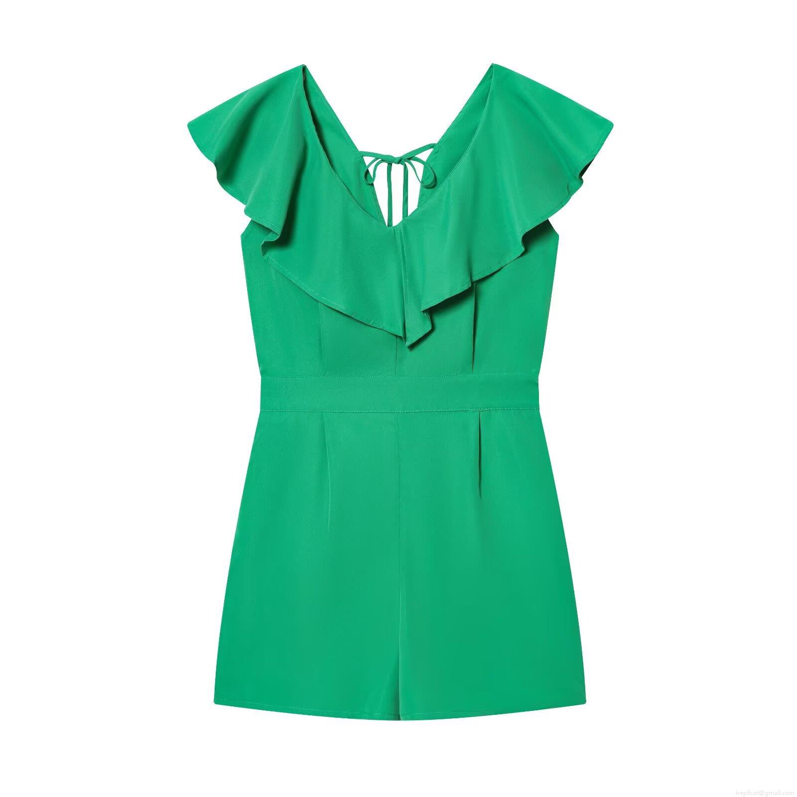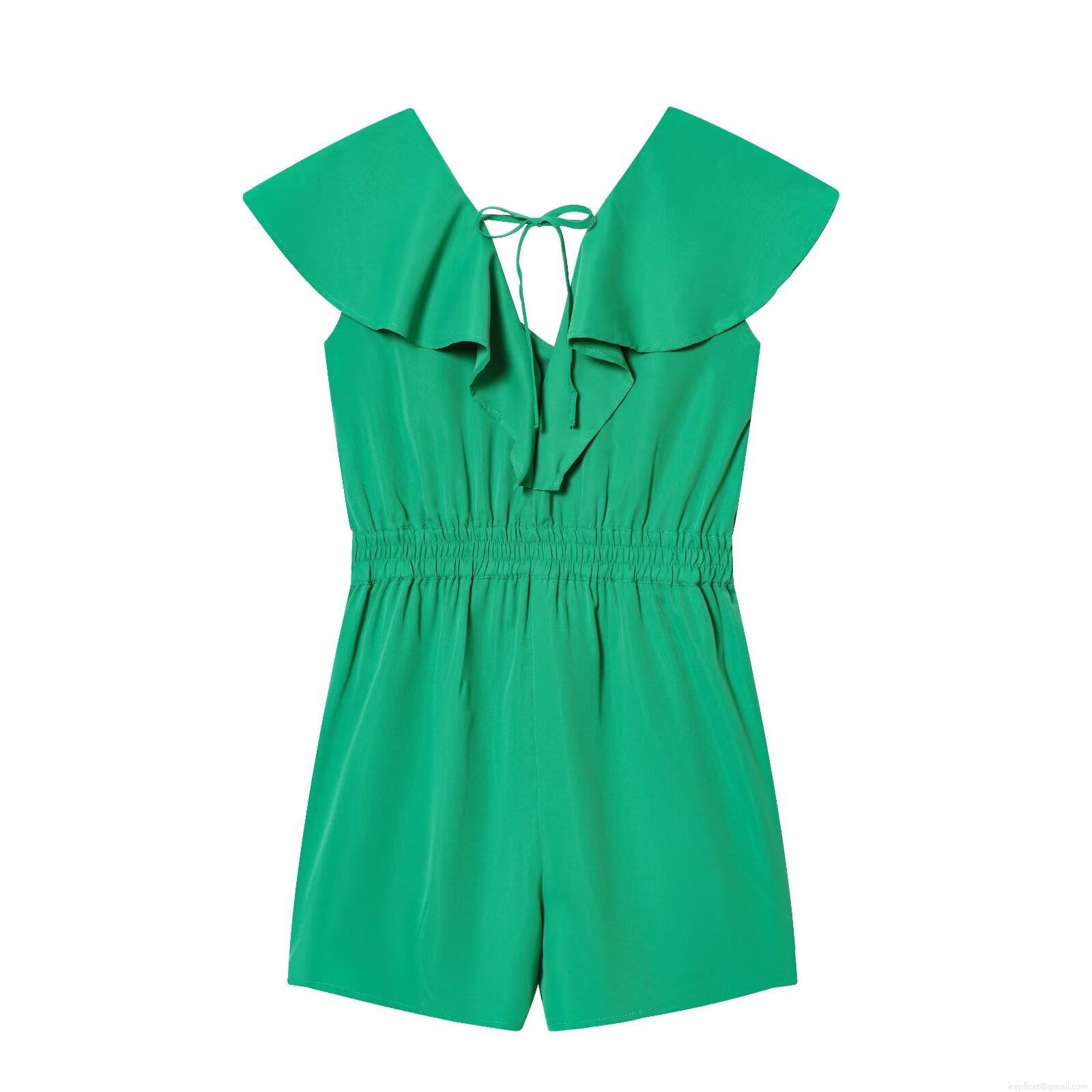 • Women Summer Casual V-Neck Ruffle Romper With Back Tie Fashion Solid Color Short Sleeve Jumpsuit For Street Vacation Party Green