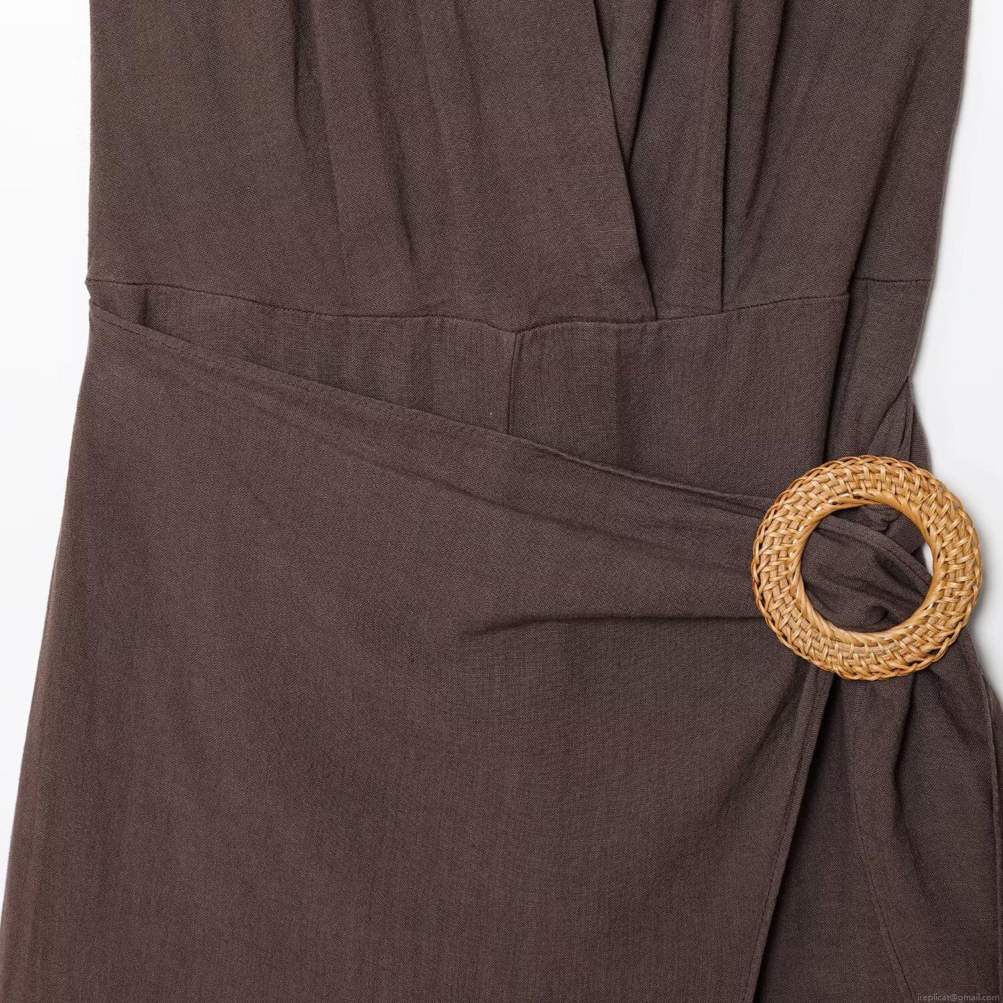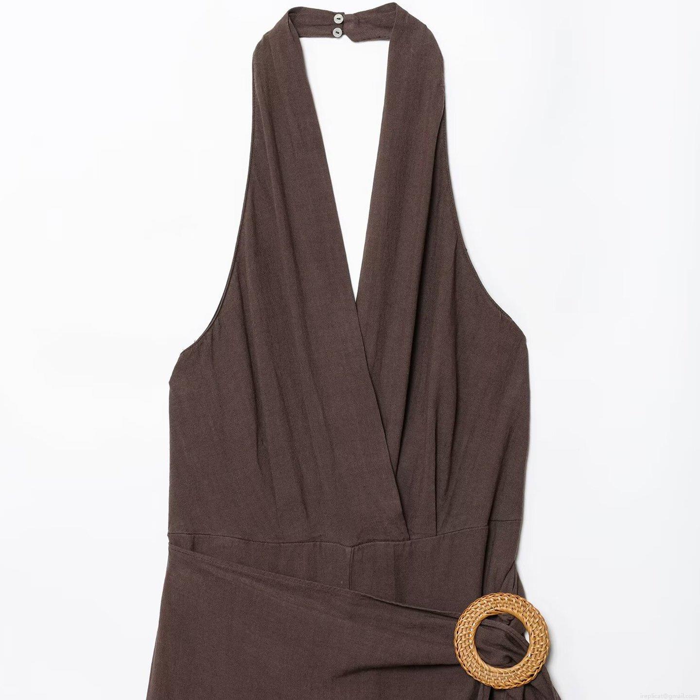 • Women Summer Halter Neck Backless Jumpsuit Fashion Casual Wide Leg Long Pants With Round Woven Buckle Polyester Mixed Linen Texture Jumpsuit
