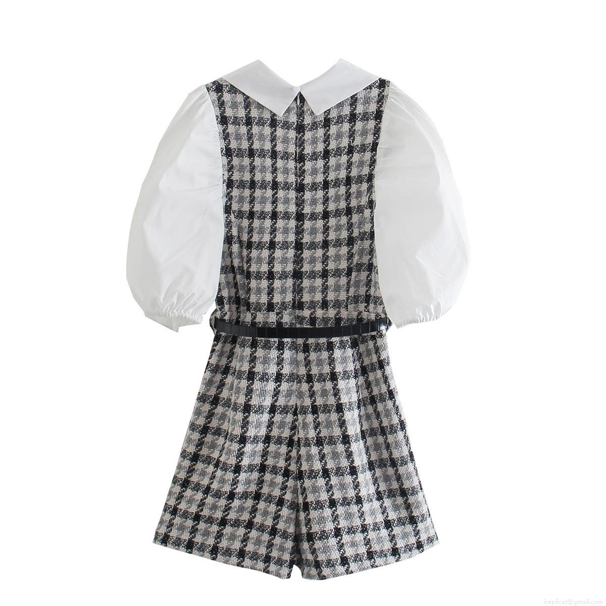 Women Vintage Plaid Romper Long Puff Sleeve Peter Pan Collar Jumpsuit With Belt Tweed Patchwork One Piece Short Pant Set Elegant Fashion Streetwear