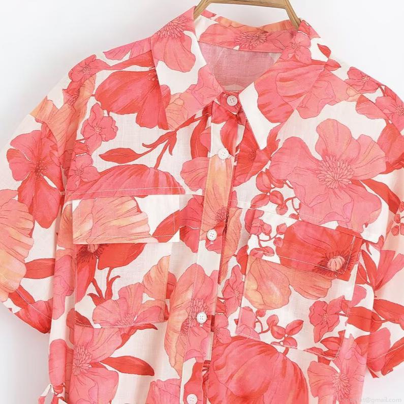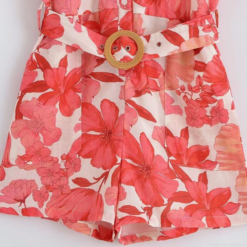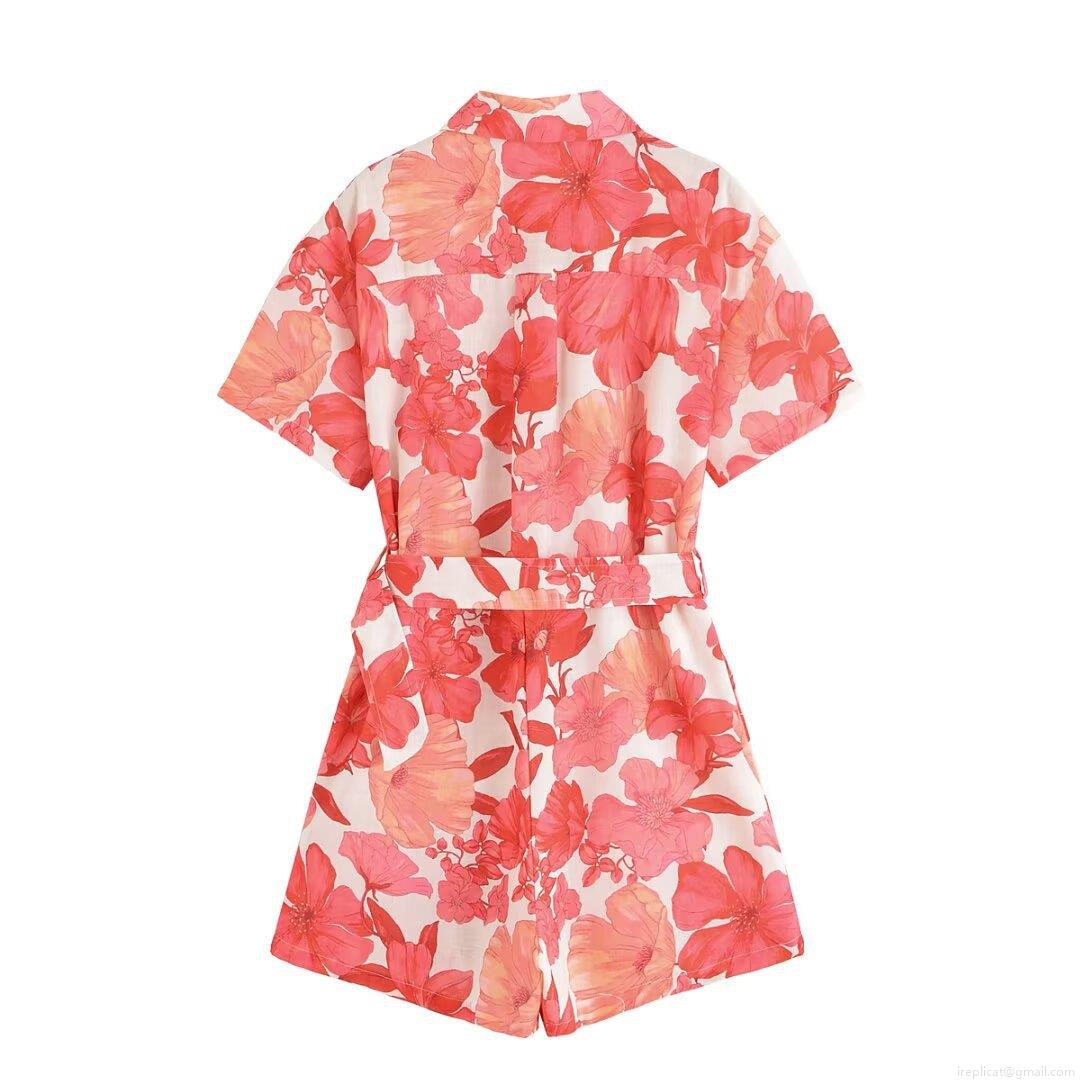 • Women's Casual Floral Print Short Sleeve Jumpsuit With Belt Turn-down Collar Button Up Summer Holiday Romper Pocket Decorative Lightweight Outfit