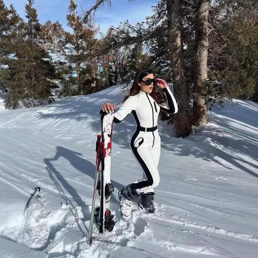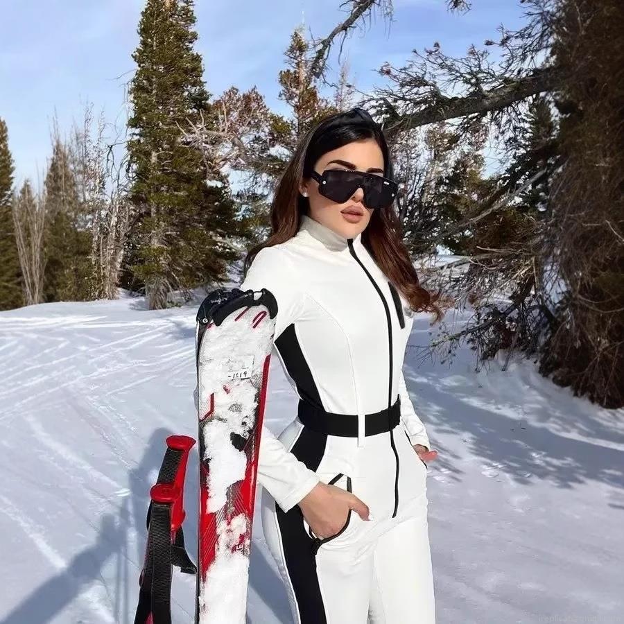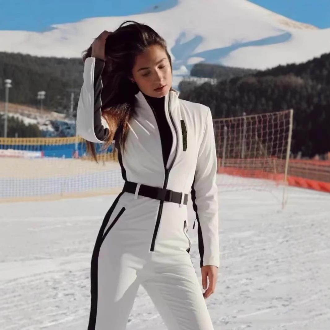 • Women's Color Block One Piece Ski Suit Waterproof Windproof Slim Fit Jumpsuit With Belt Outdoor Winter Sportswear Snowsuit