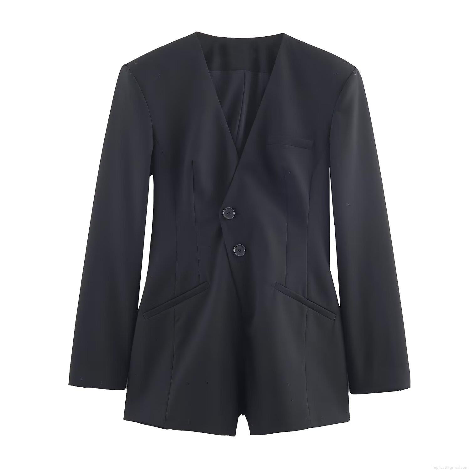 Solid Color, Deep V-neck, Two Buttons, Double-breasted Design, Shoulder Pad Structure