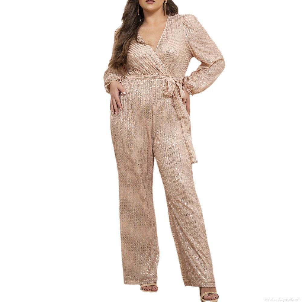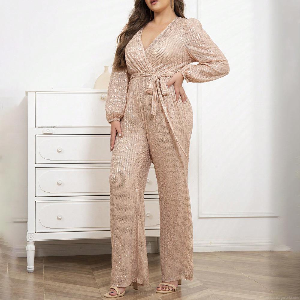• Women's Elegant Deep V-Neck Sequin Jumpsuit Long Sleeve Tie Waist Straight Leg Overall Champagne Gold Sexy Party Evening Club Romper For Ladies