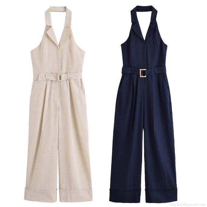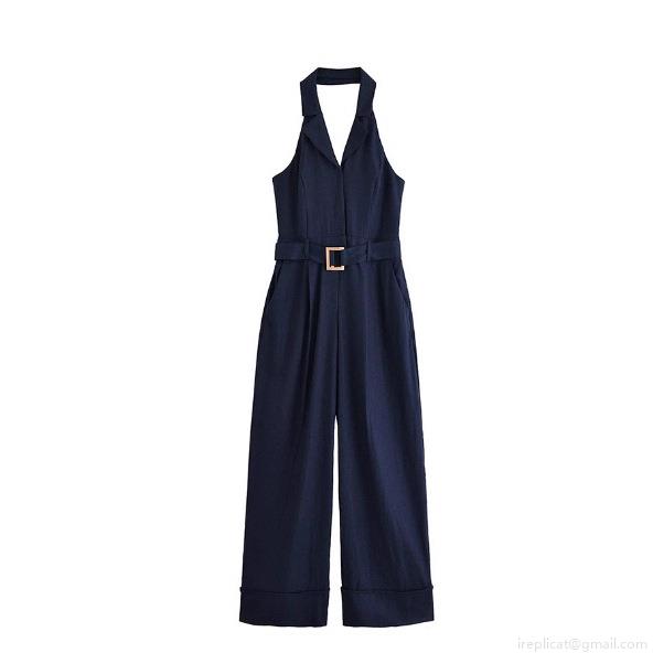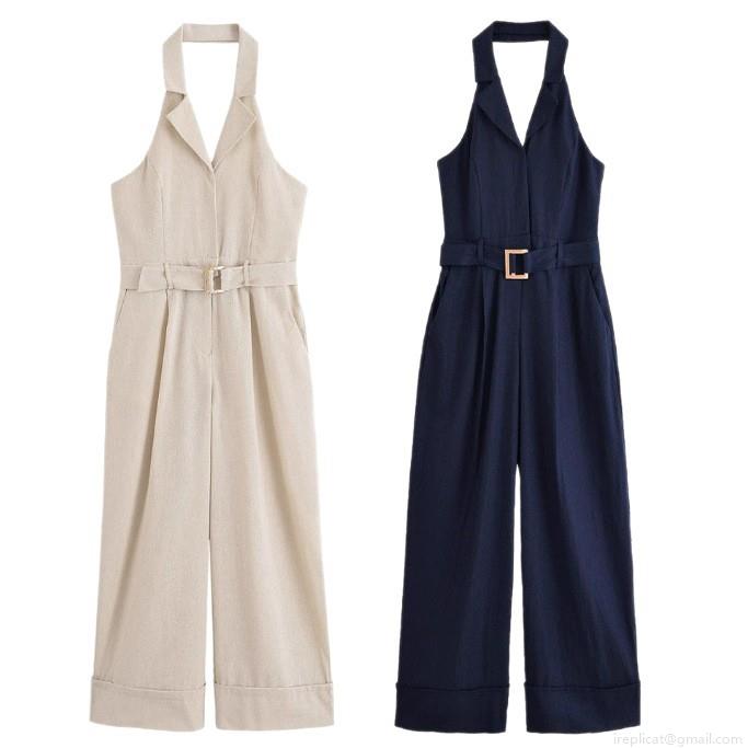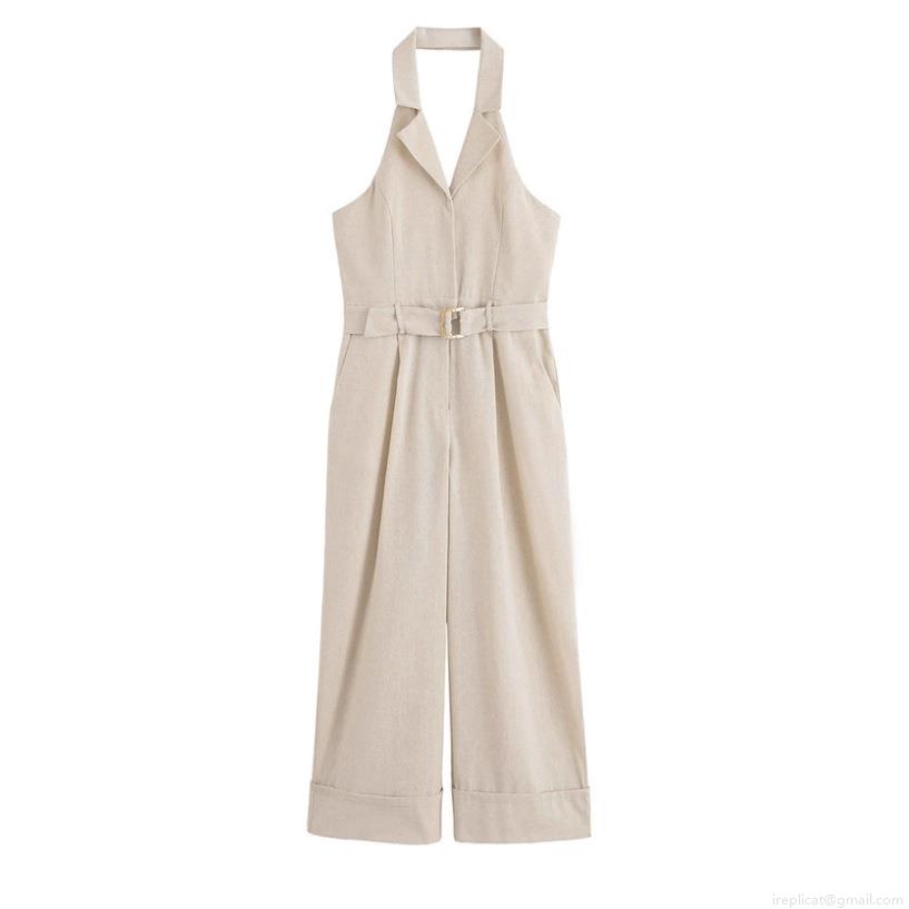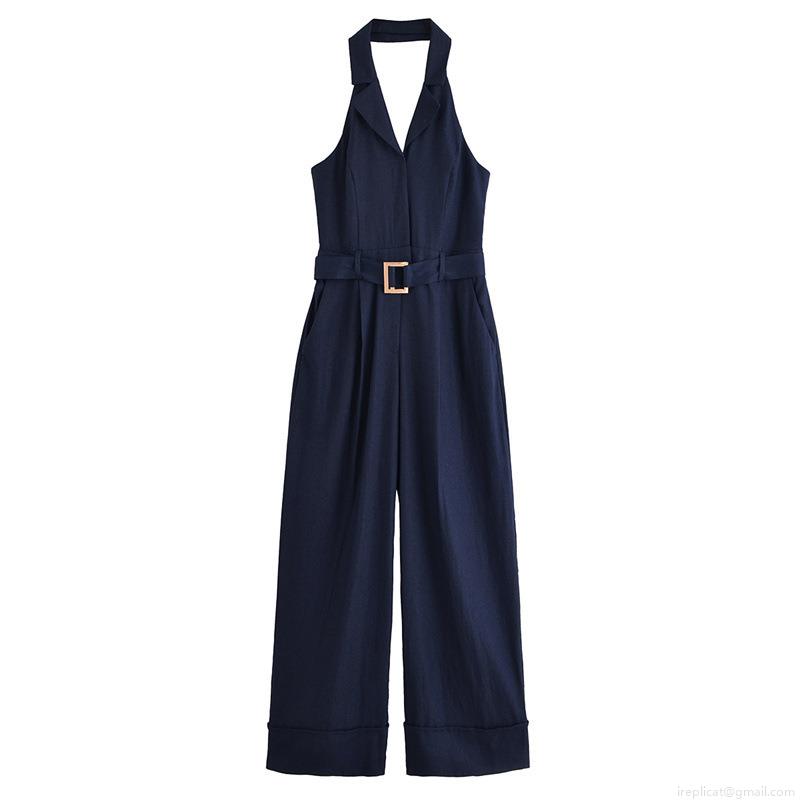 • Women's Elegant Halter Neck Jumpsuit with Metal Buckle Belt Lapel Collar Sleeveless High Waist Wide Leg Long Pants Modern Office Business Chic One-Piece Outfit