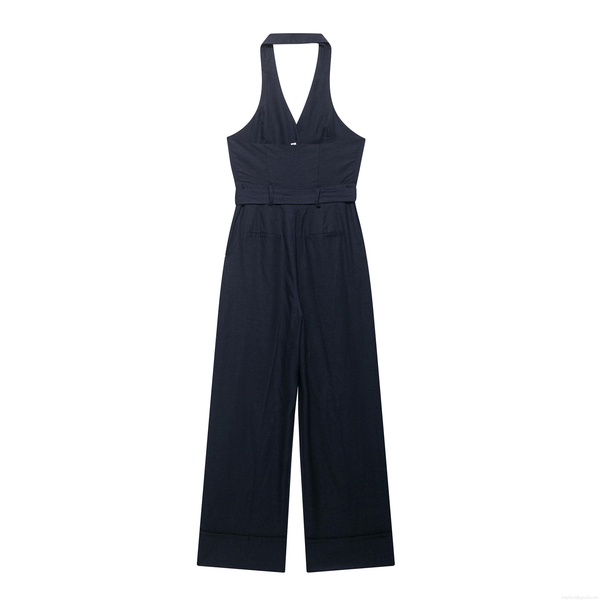 • Women's Halter Neck V-Neck Backless Jumpsuit With Belt Elegant Wide Leg Office Street Chic Summer Navy Blue Polyester Jumpsuit