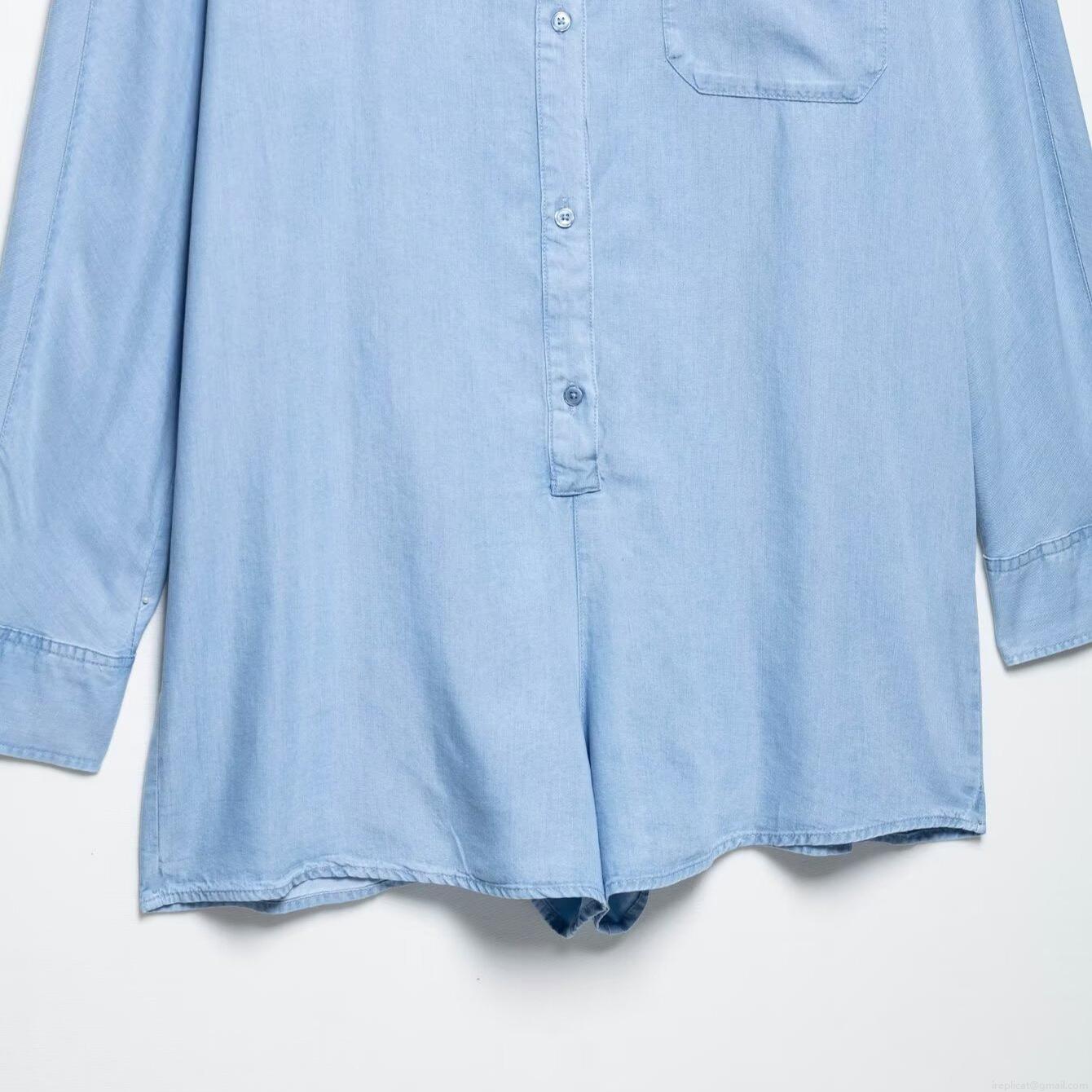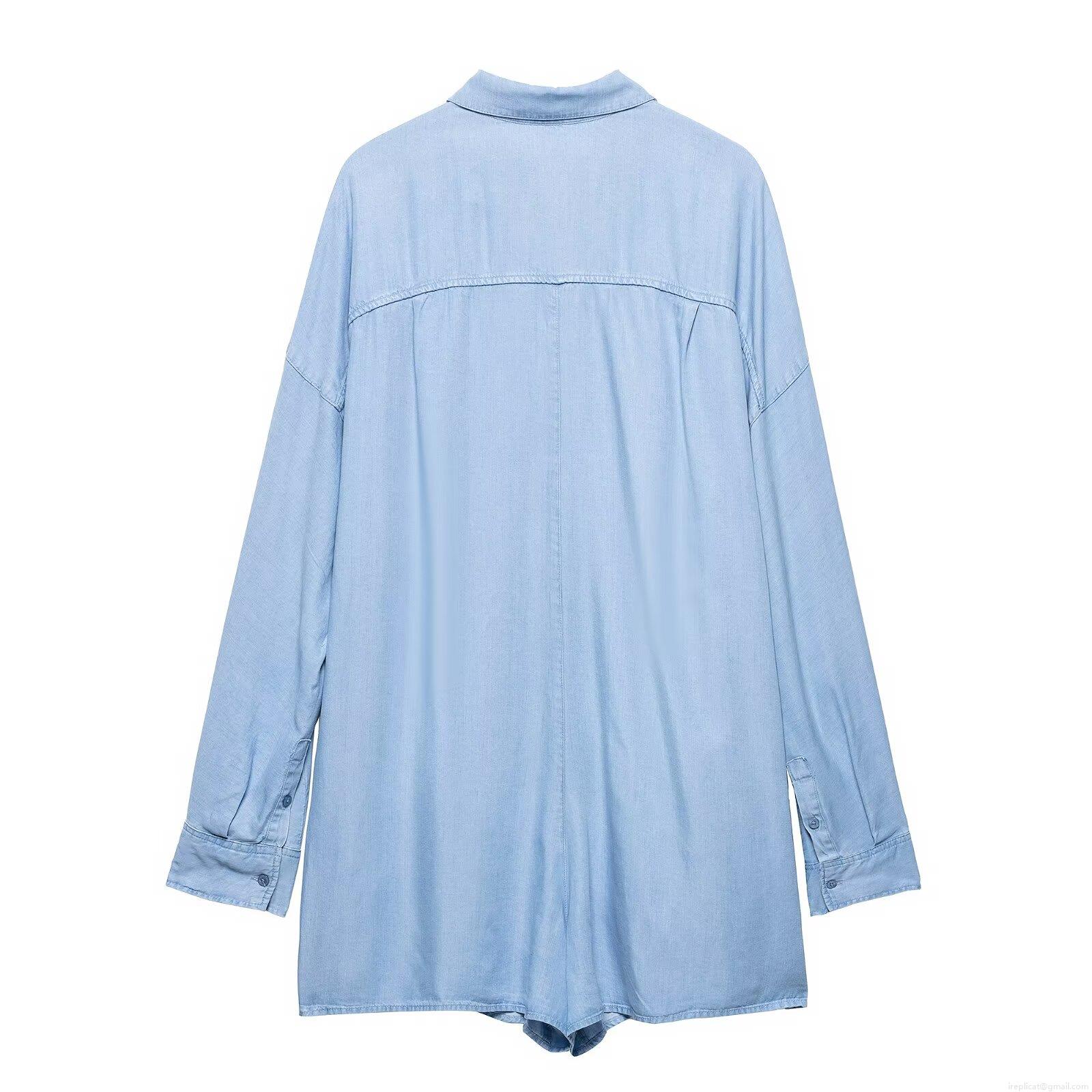 • Women's Light Blue Denim Romper Jumpsuit Cotton Blend Long Sleeve Button Up Short Playsuit With Pocket Turn Down Collar Casual Elegant Lady Outfit