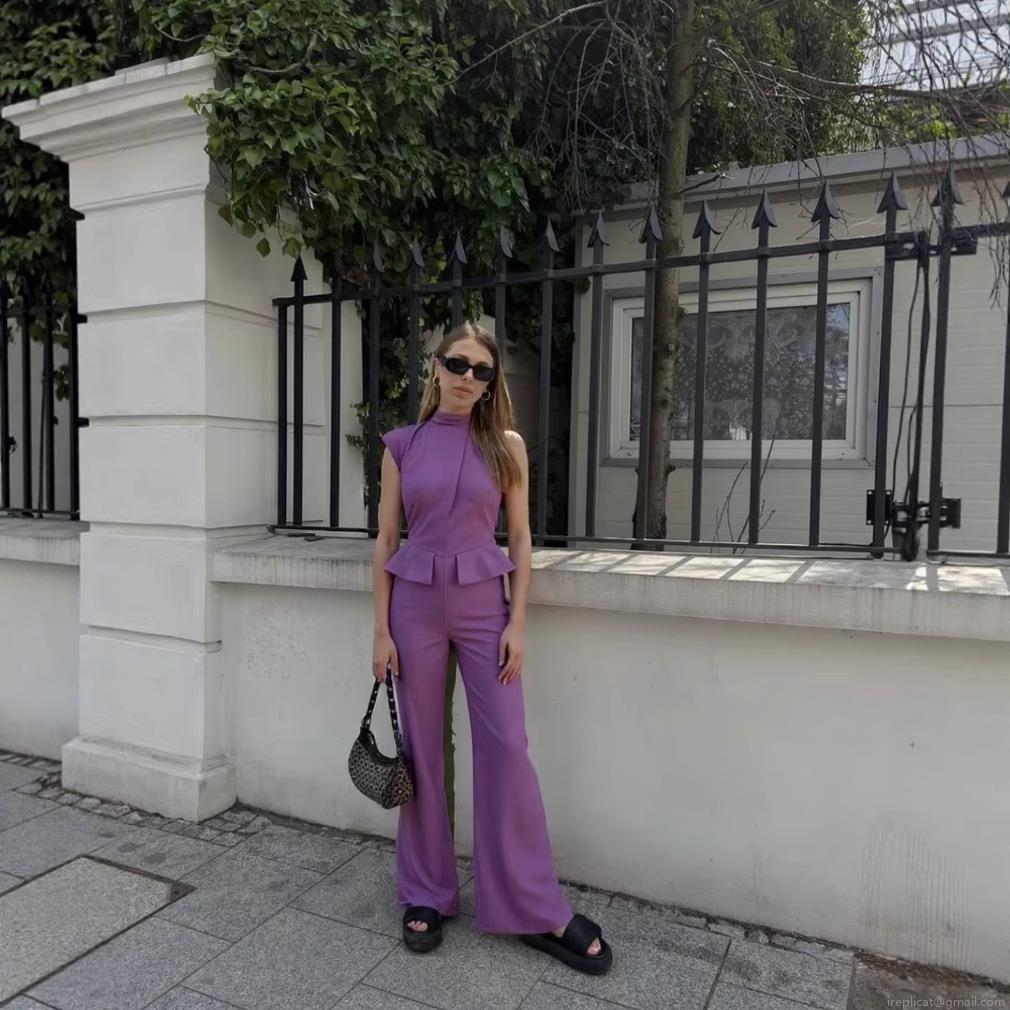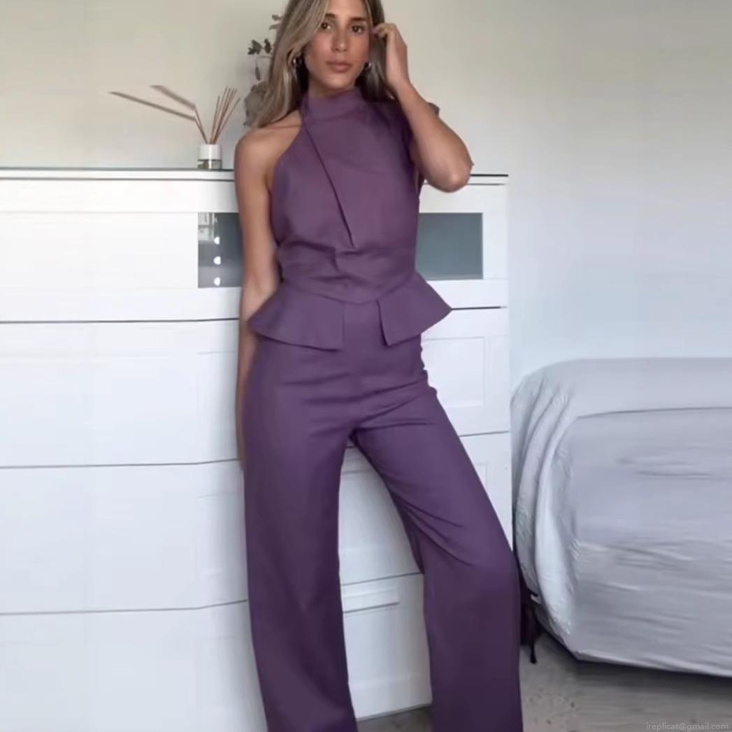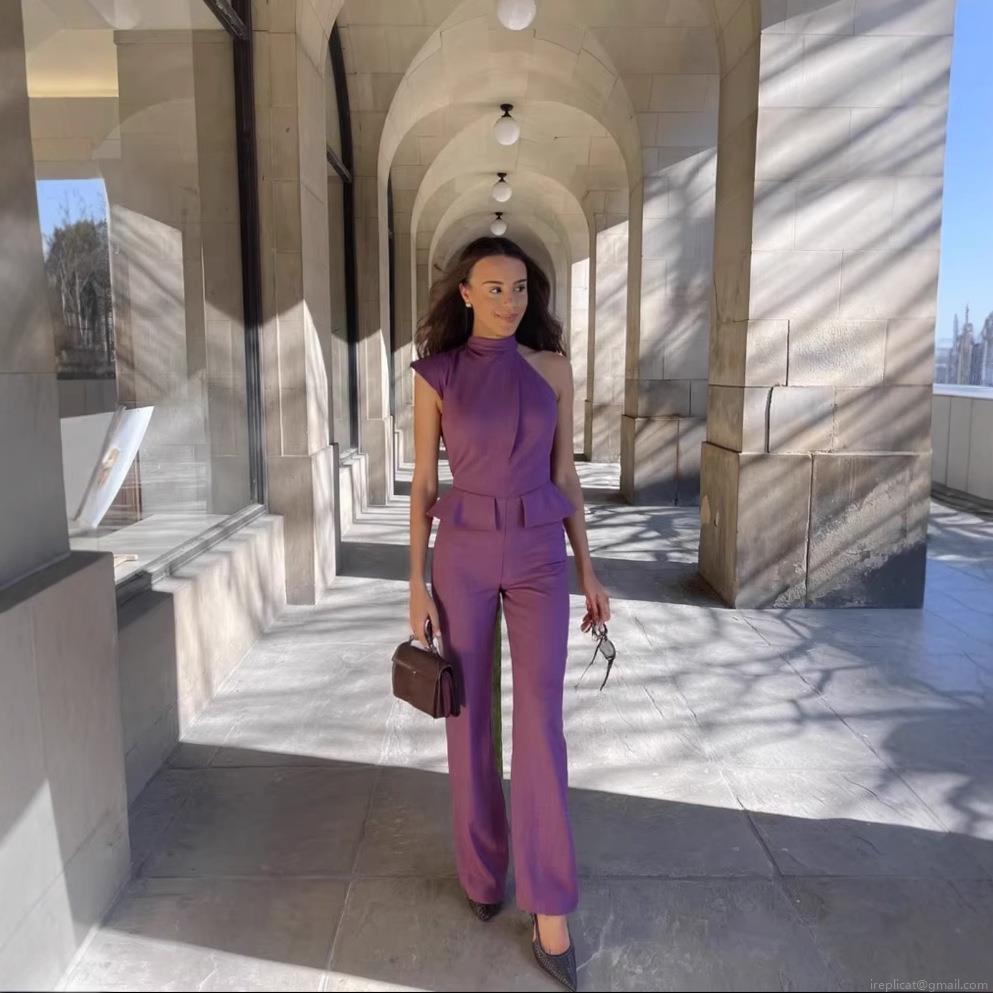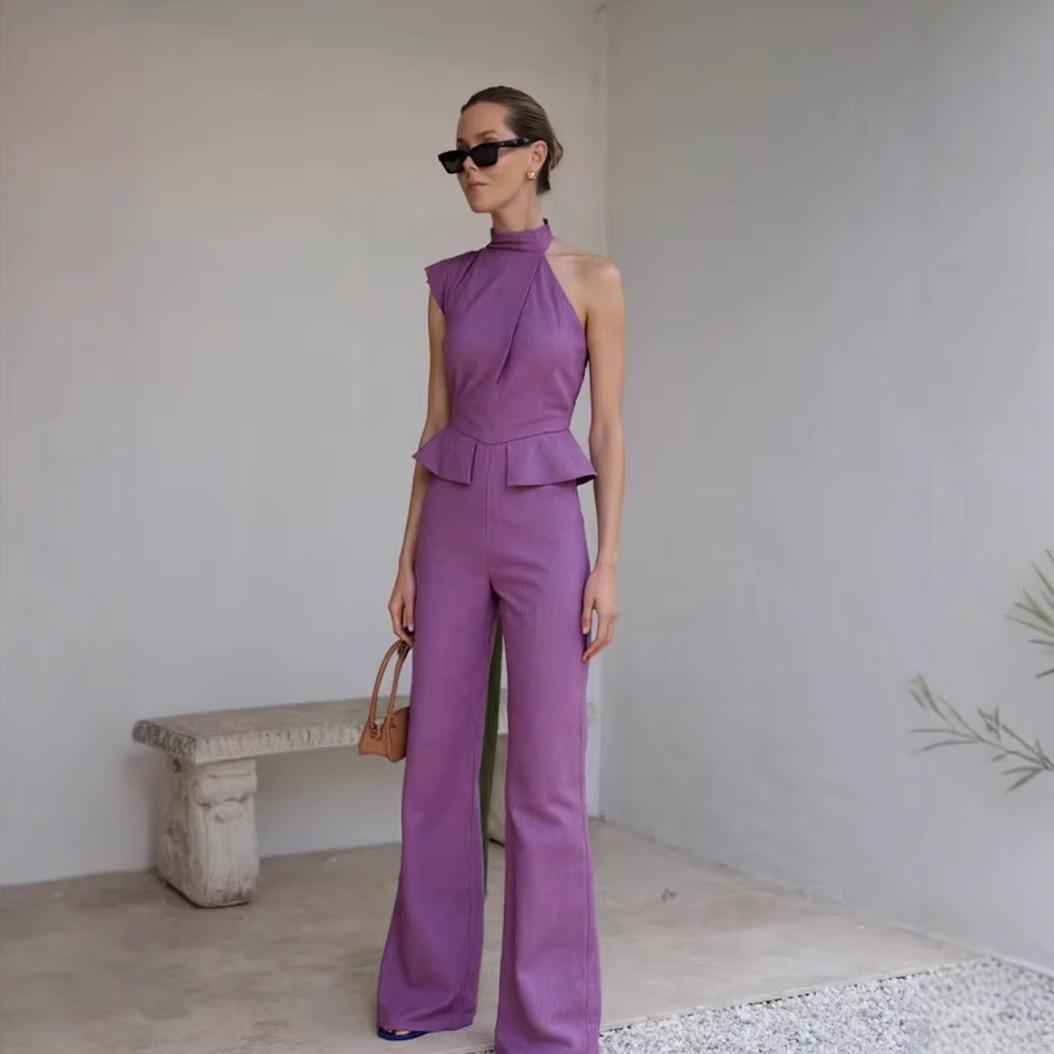 Solid Color, Ruffles, Wide-leg Pants, One-shoulder Asymmetrical Neckline, Peplum Waist-cinching