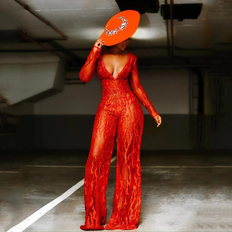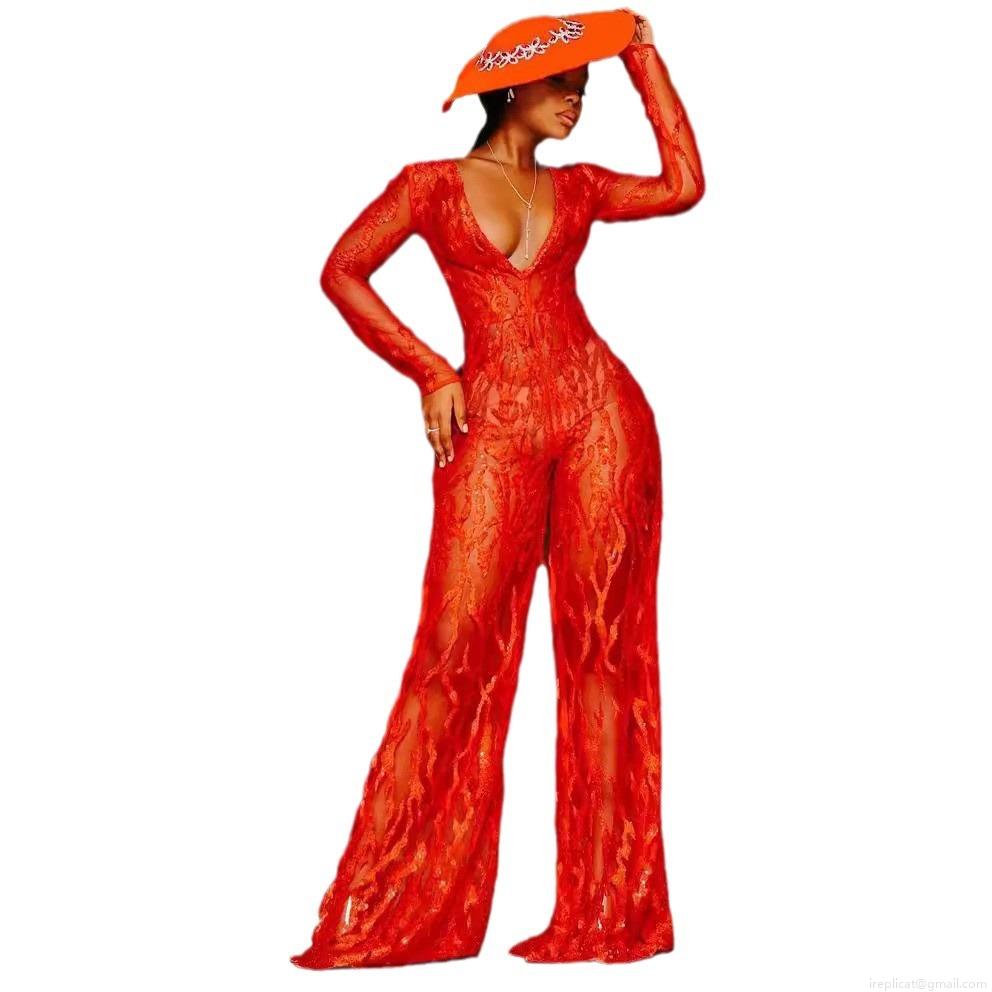• Women's Sexy Deep V-Neck Sequin Lace Jumpsuit Long Sleeve Wide Leg Party Evening Clubwear Romper Elegant High Waist One Piece Outfit