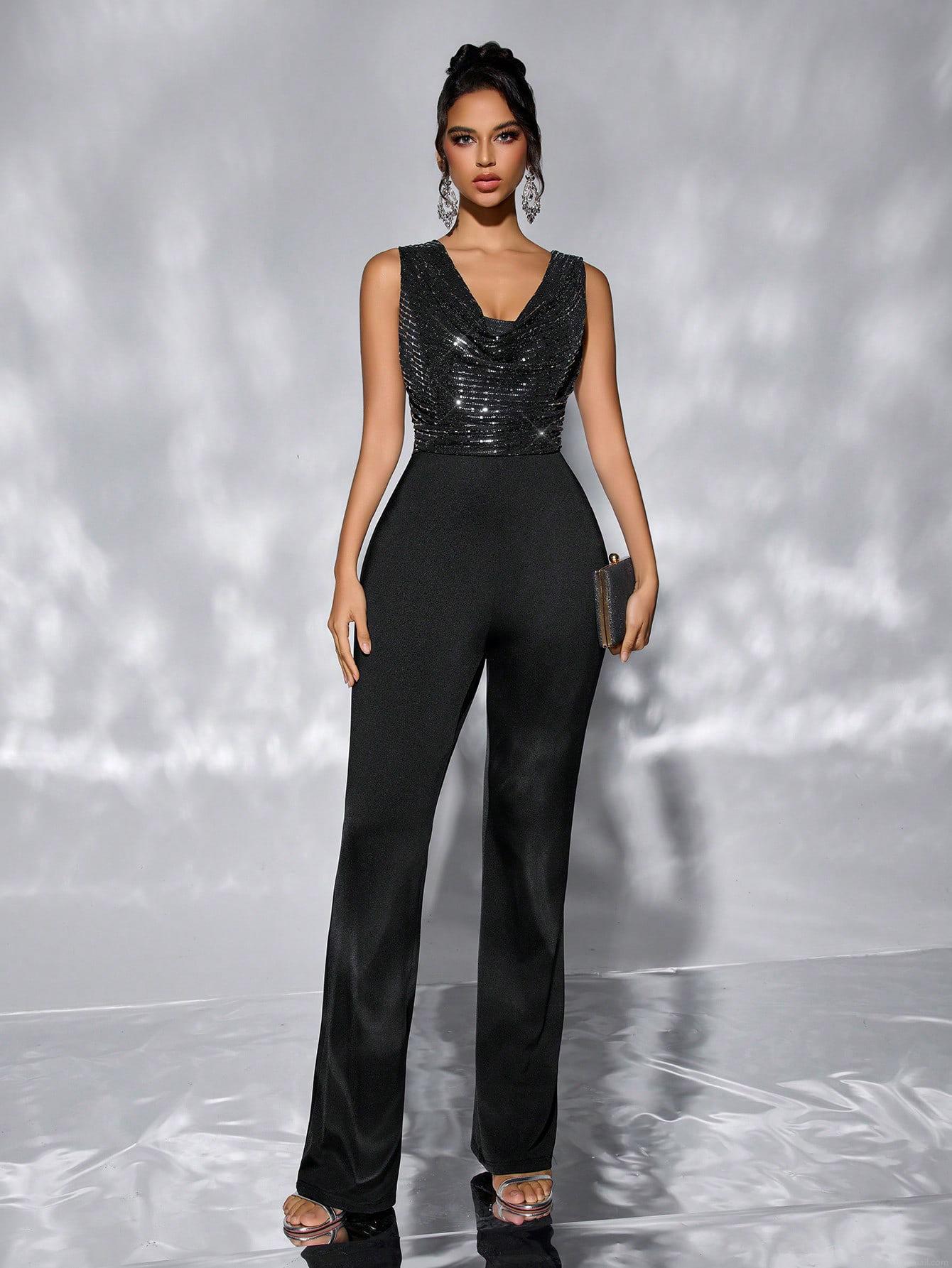 • Women's Sexy Sequin Sleeveless Jumpsuit Deep V-Neck Wide-Leg One-Piece Romper Elegant Evening Party Jumpsuit High Waist Black Long Trousers