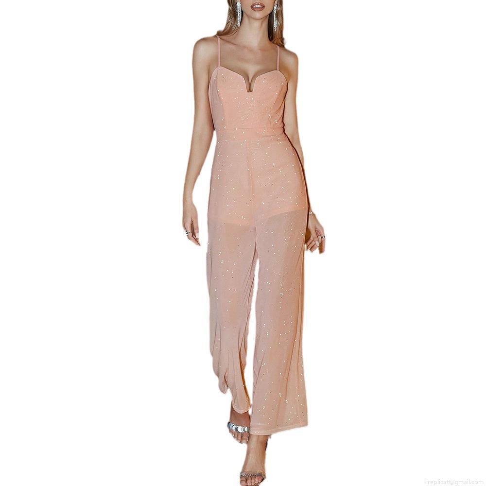 • Women's Sexy V-Neck Sequin Cami Jumpsuit Glitter Mesh Patchwork Wide Leg One Piece Romper Sleeveless Slim Fit Party Evening Night Out Pink