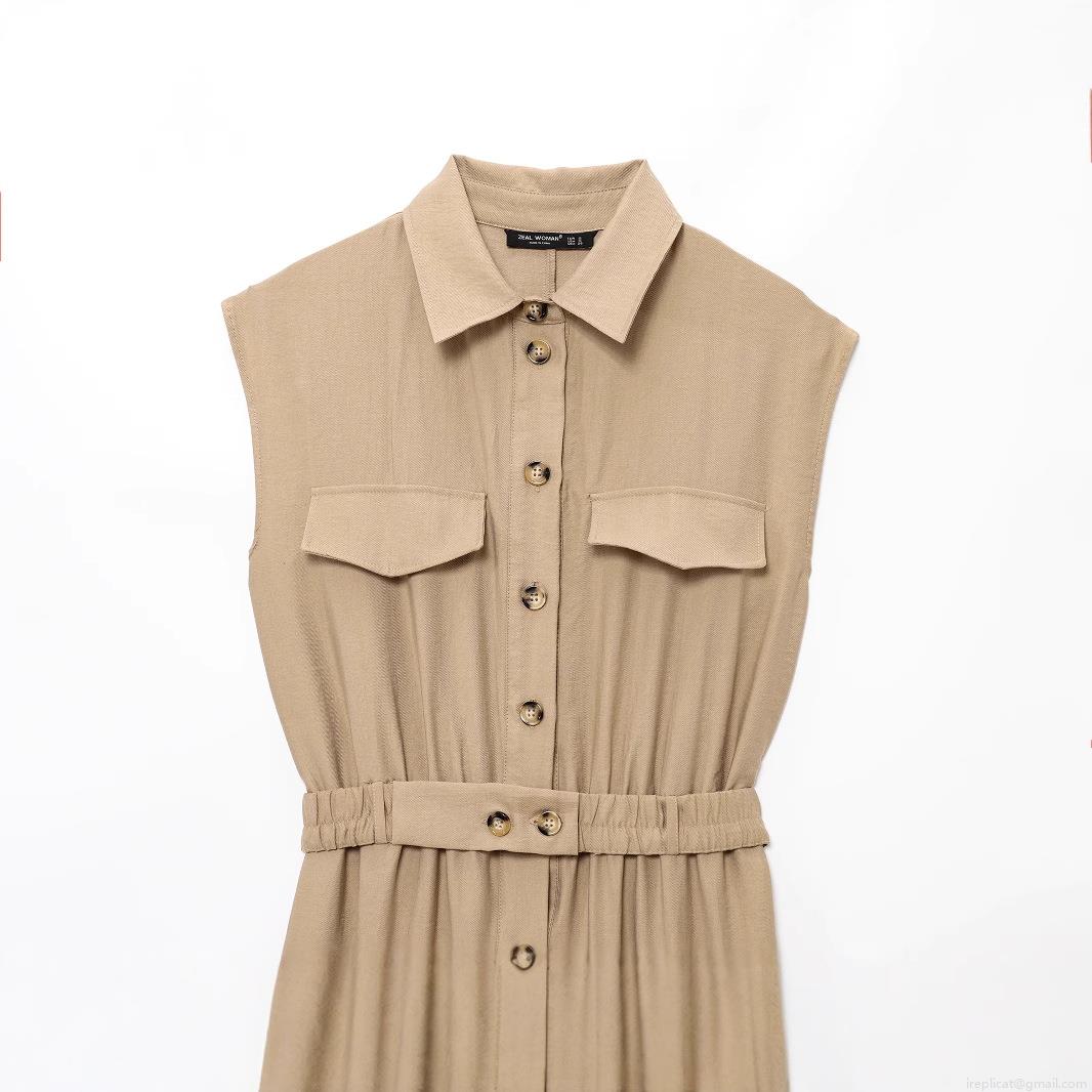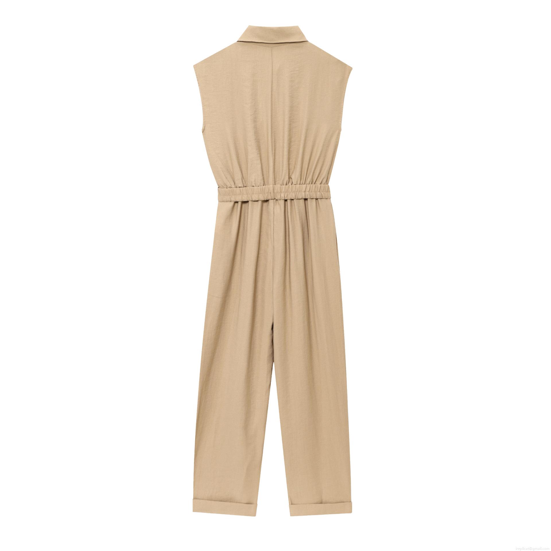 • Women's Sleeveless Jumpsuit Solid Color Cotton Blend Workwear Style Lapel Button Up Romper With Belt Straight Leg Commuter Long Jumpsuits For Ladies