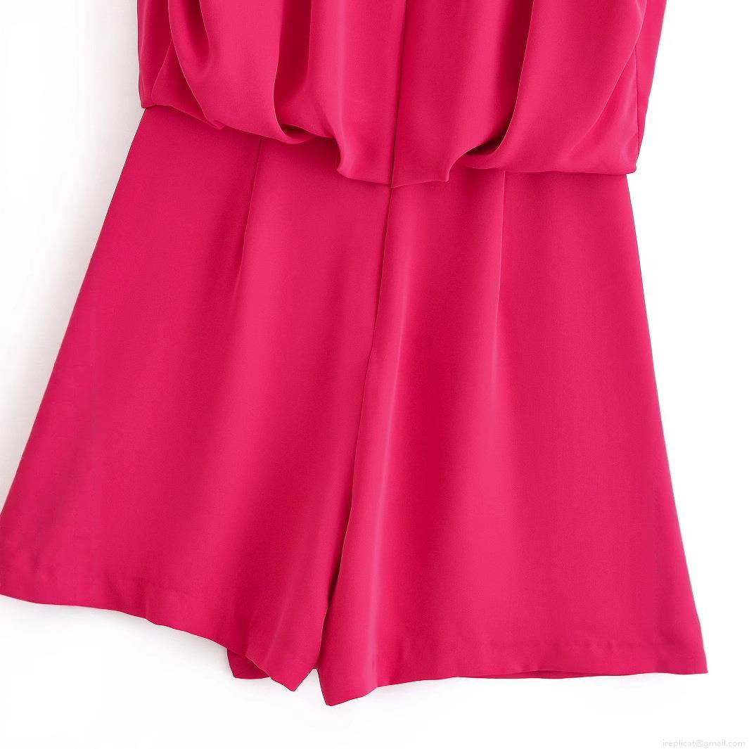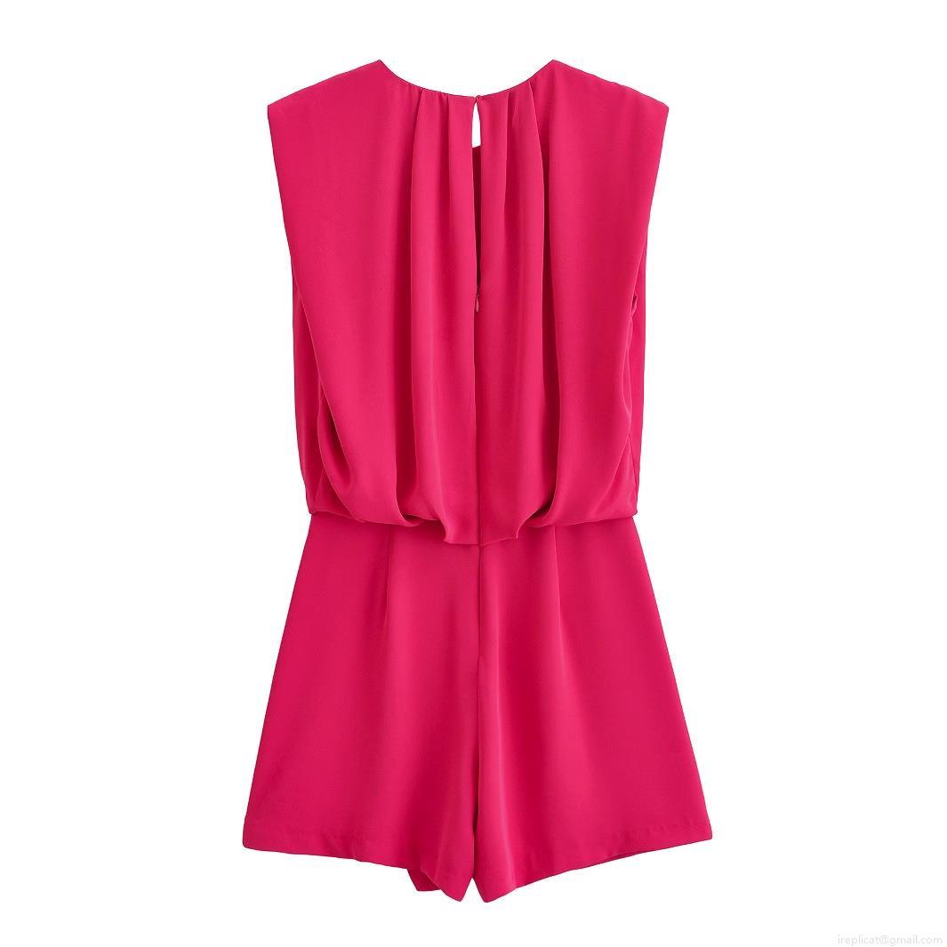 • Women's Sleeveless Round Neck Pleated Romper Short Jumpsuit Solid Rose Red Elegant Summer Casual One-Piece Fashion Outfit For Women