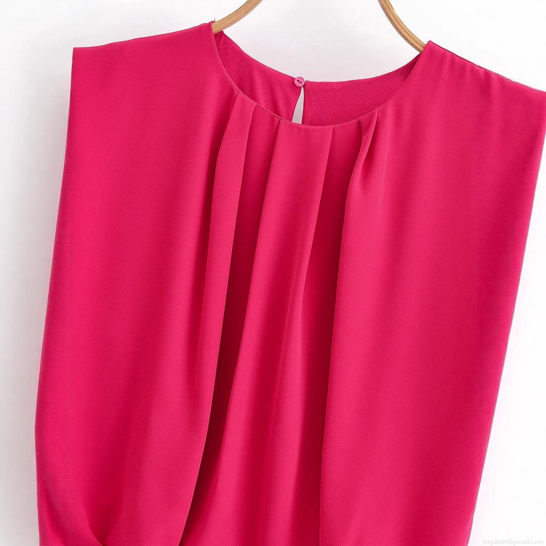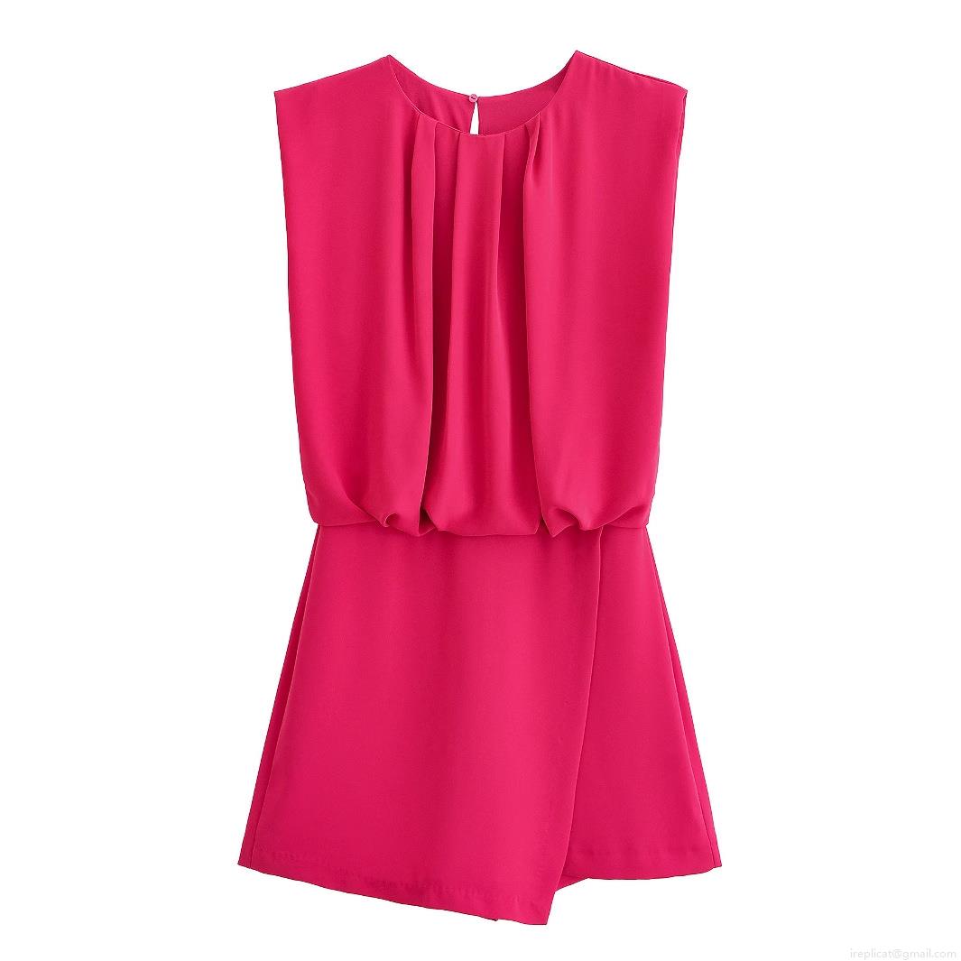Women's Sleeveless Round Neck Pleated Romper Short Jumpsuit Solid Rose Red Elegant Summer Casual One-Piece Fashion Outfit For Women