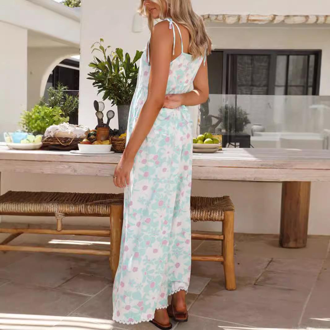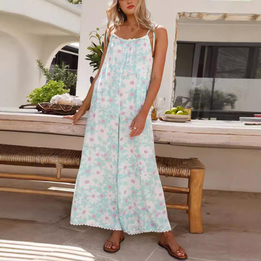• Women's Summer Floral Print Jumpsuit Polyester Backless Wide Leg Sleeveless Romper With Lace Trim For Beach Vacation