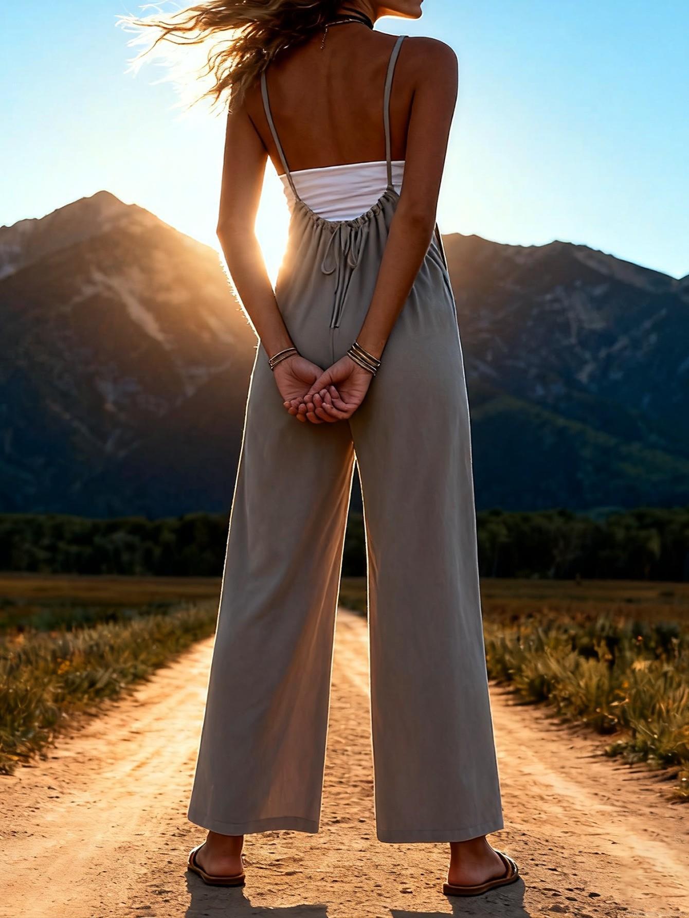 • Women's Wide Leg Jumpsuit Sleeveless Solid Color Backless Suspender Romper Casual Vacation Loose Fit 100% Polyester Summer Overall With Pockets