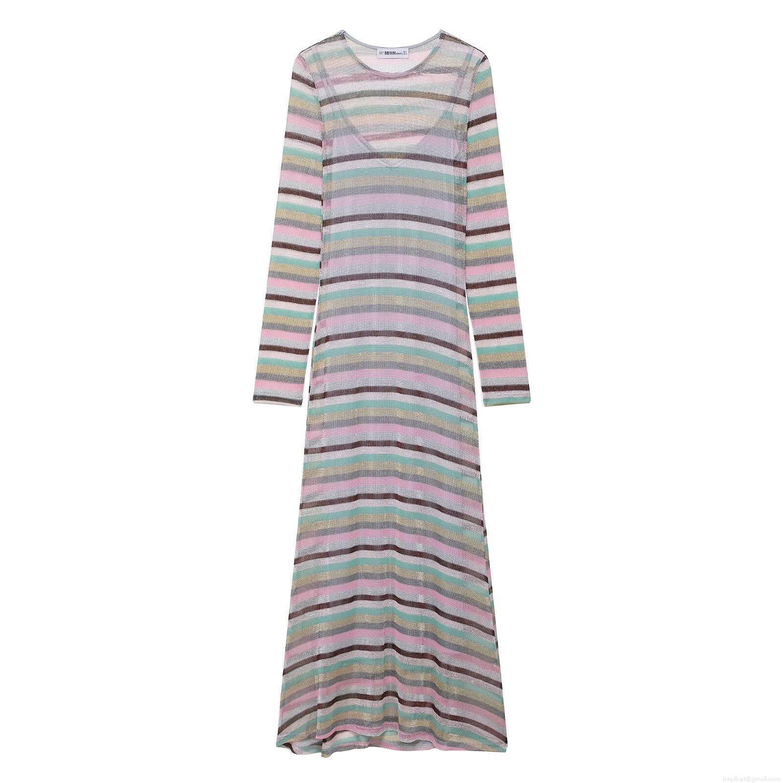 • Women Colorful Rainbow Striped Knitwear 3 Piece Set Breathable Hollow Out Knit Vest Wide Leg Pants Long Sleeve Slim Dress Vacation Beachwear Streetwear Western Style Outfit