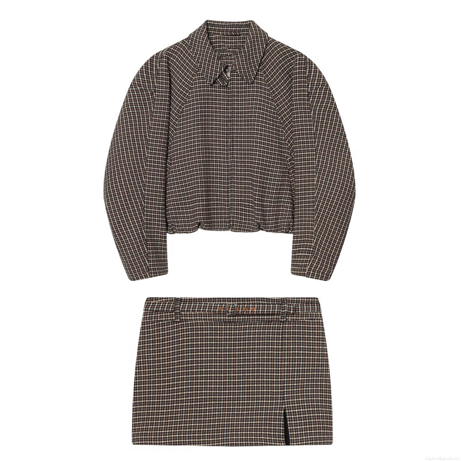 • Women Retro Houndstooth Two Piece Set Boucle Tweed Zipper Jacket And Belted Split Mini Skirt Casual British Style Autumn Winter Outfits For Lady