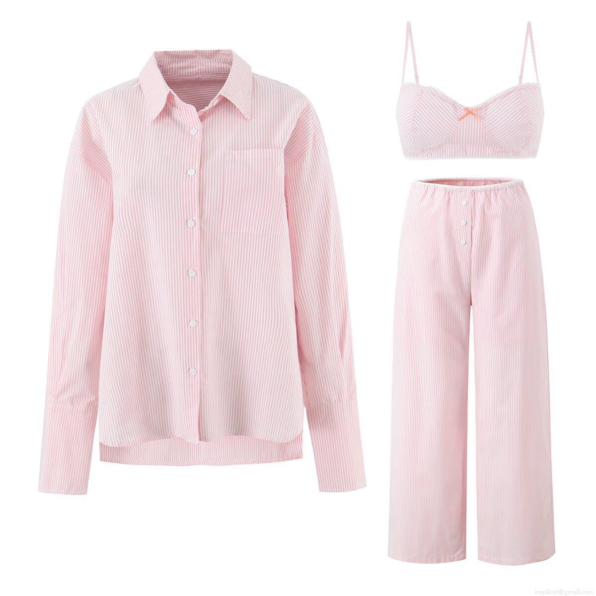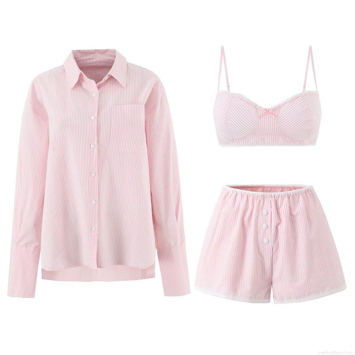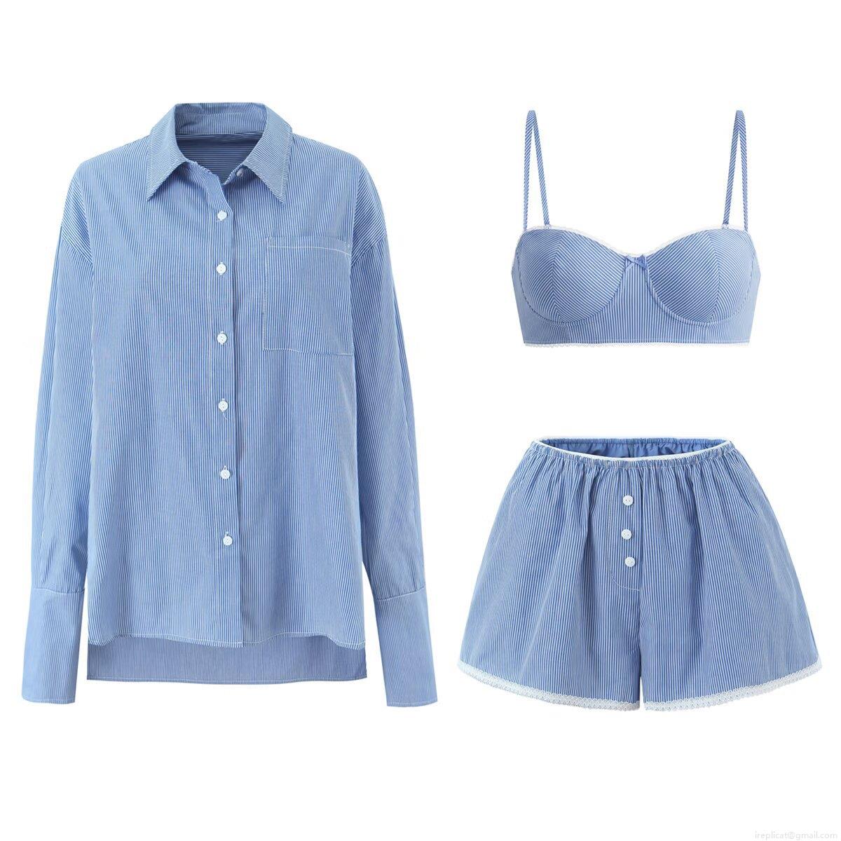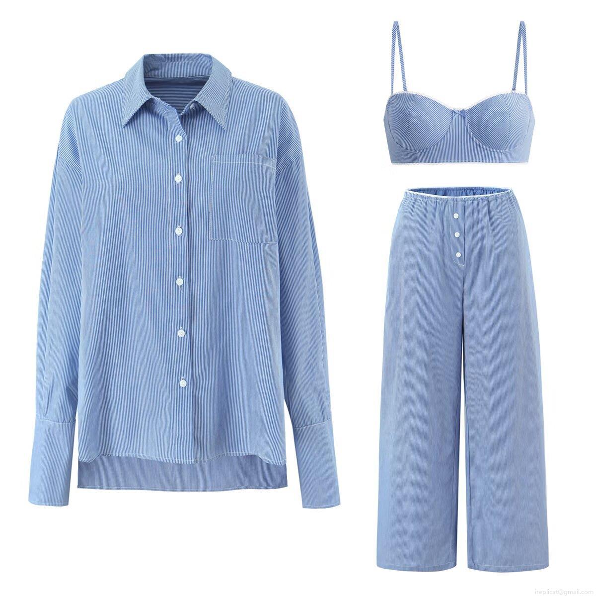 • Women's 100% Cotton Striped Loungewear Set 3-Piece Casual Summer Pajama Suit With Long Sleeve Button Shirt Camisole Shorts And Wide Leg Pants For Women Nightwear