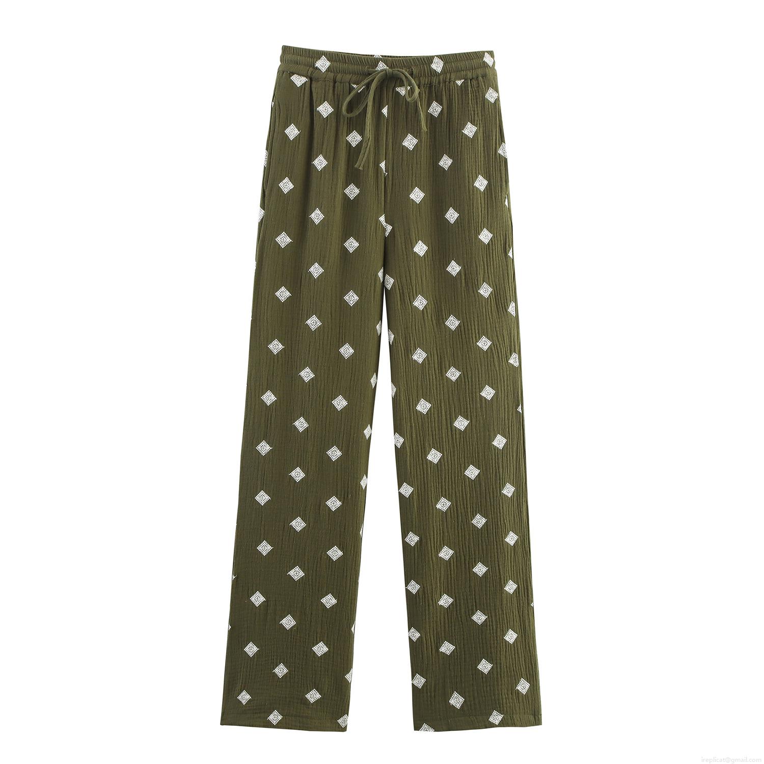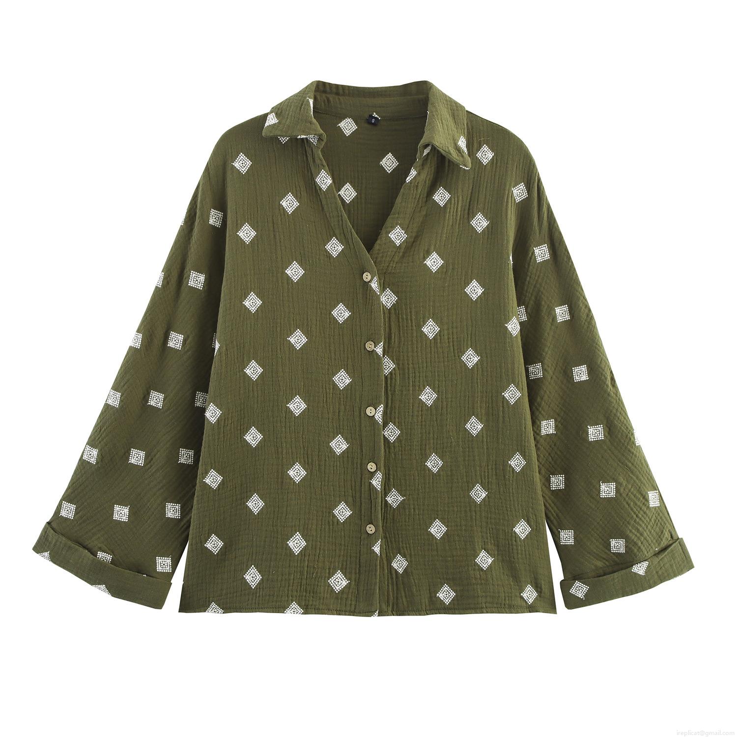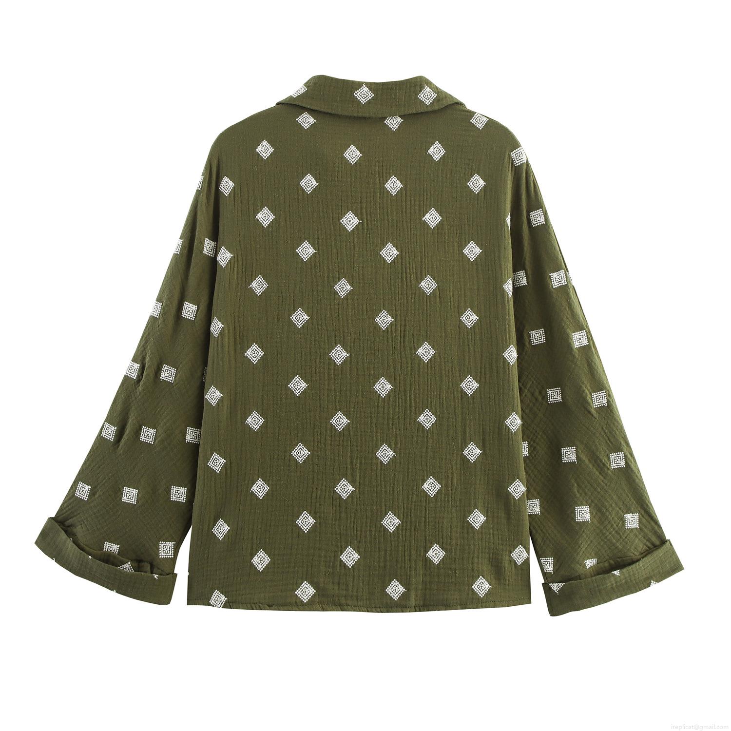 • Women's Casual 2 Piece Lounge Set Cotton Crepe Embroidery Long Sleeve Button Down Shirt and Wide Leg Pants Set Olive Green Geometric Print Streetwear Outfit