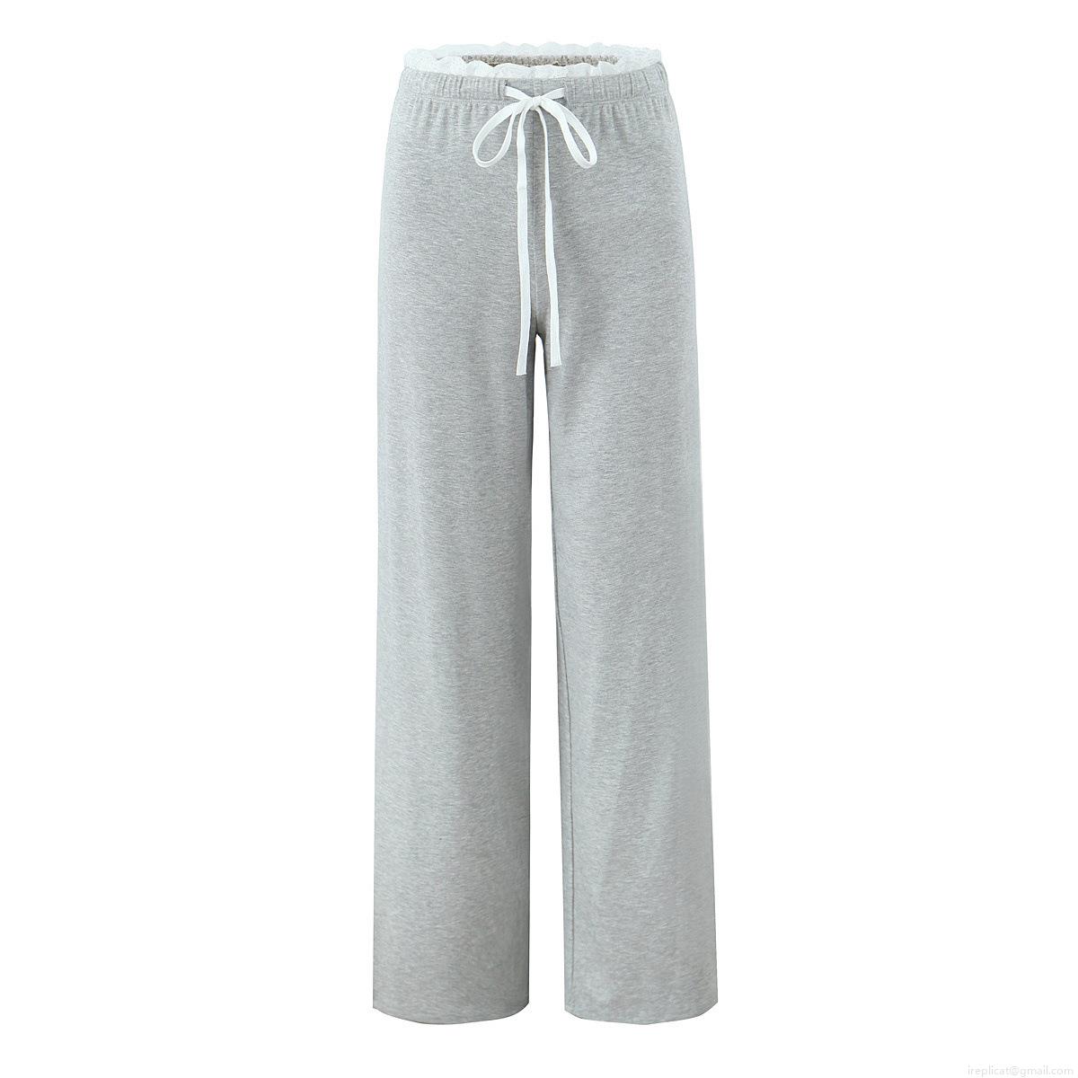 • Women's Casual Cotton Blend Rib Knit Loungewear Set Lace Trim Long Sleeve U-Neck Crop Top With Thumb Holes And High Waist Wide Leg Drawstring Pants Two Piece Suit Home Streetwear