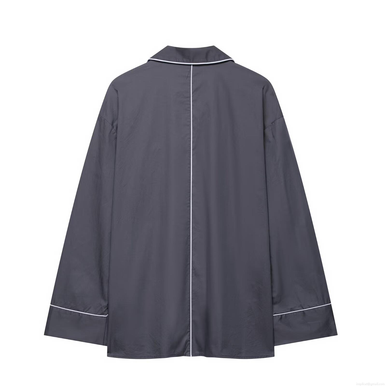• Women's Casual Long Sleeve Piping Poplin Shirt And Paperbag Waist Shorts Loungewear Set Solid Color Loose Two Piece Home Wear For Women