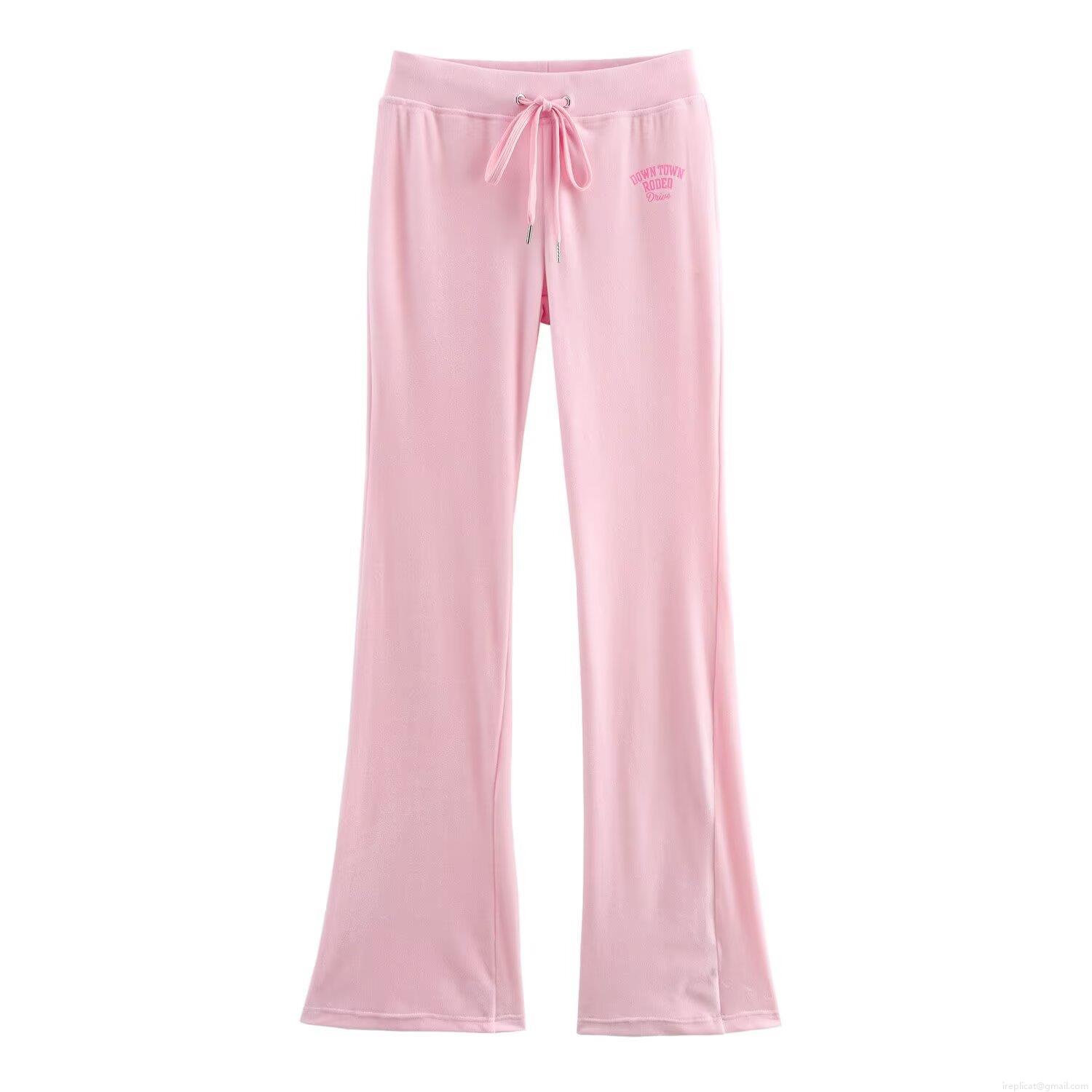 • Women's Fashion Pink Velour Tracksuit Set Hooded Zip-up Velvet Hoodie and Drawstring Flare Pants 2 Piece Lounge Set With Downtown Rodeo Print For Spring Autumn Casual Wear