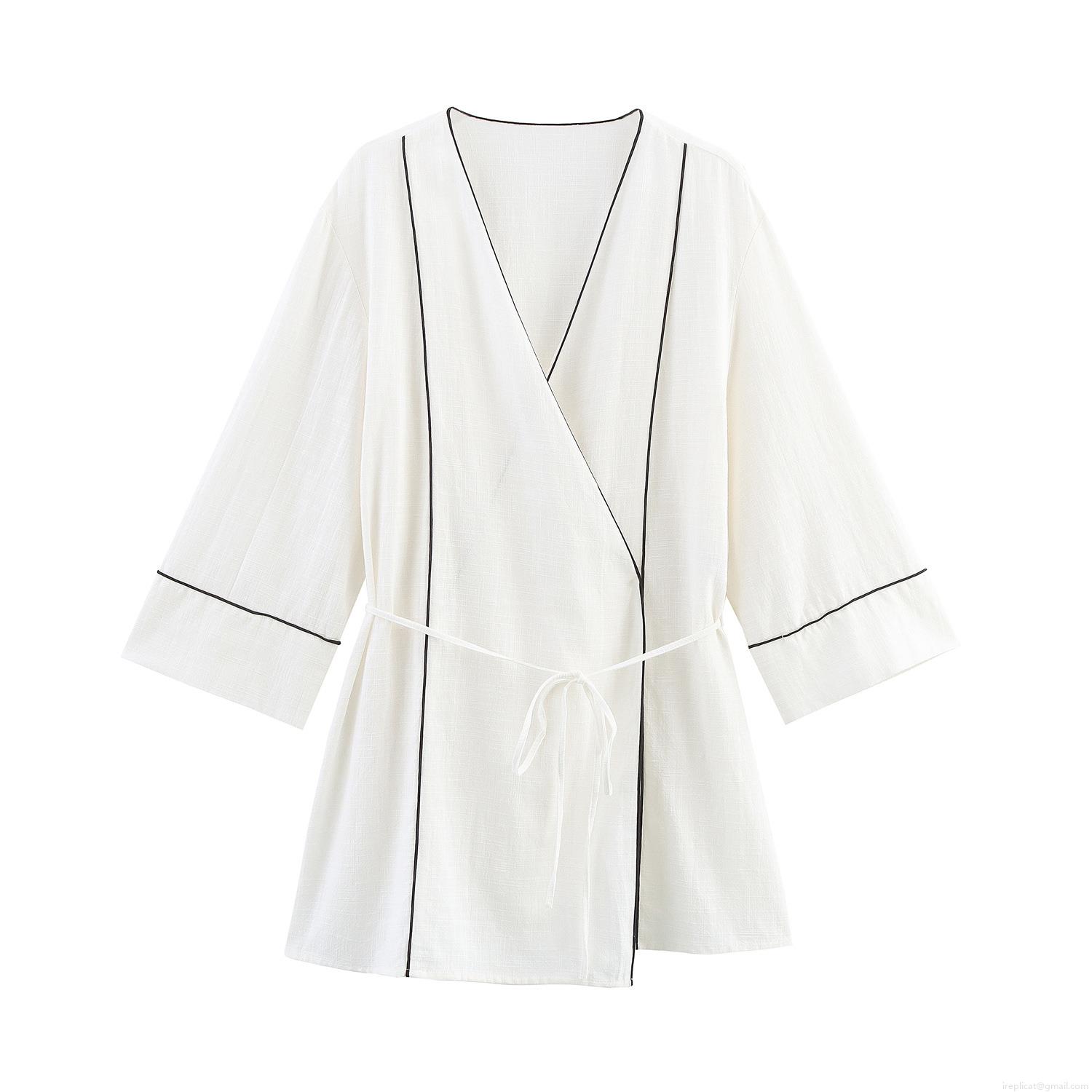 Women's Pajama Set Contrast Piping V Neck Kimono Top Wide Leg Pants Two Piece Loungewear Casual Elegant Polyester Sets For Lady