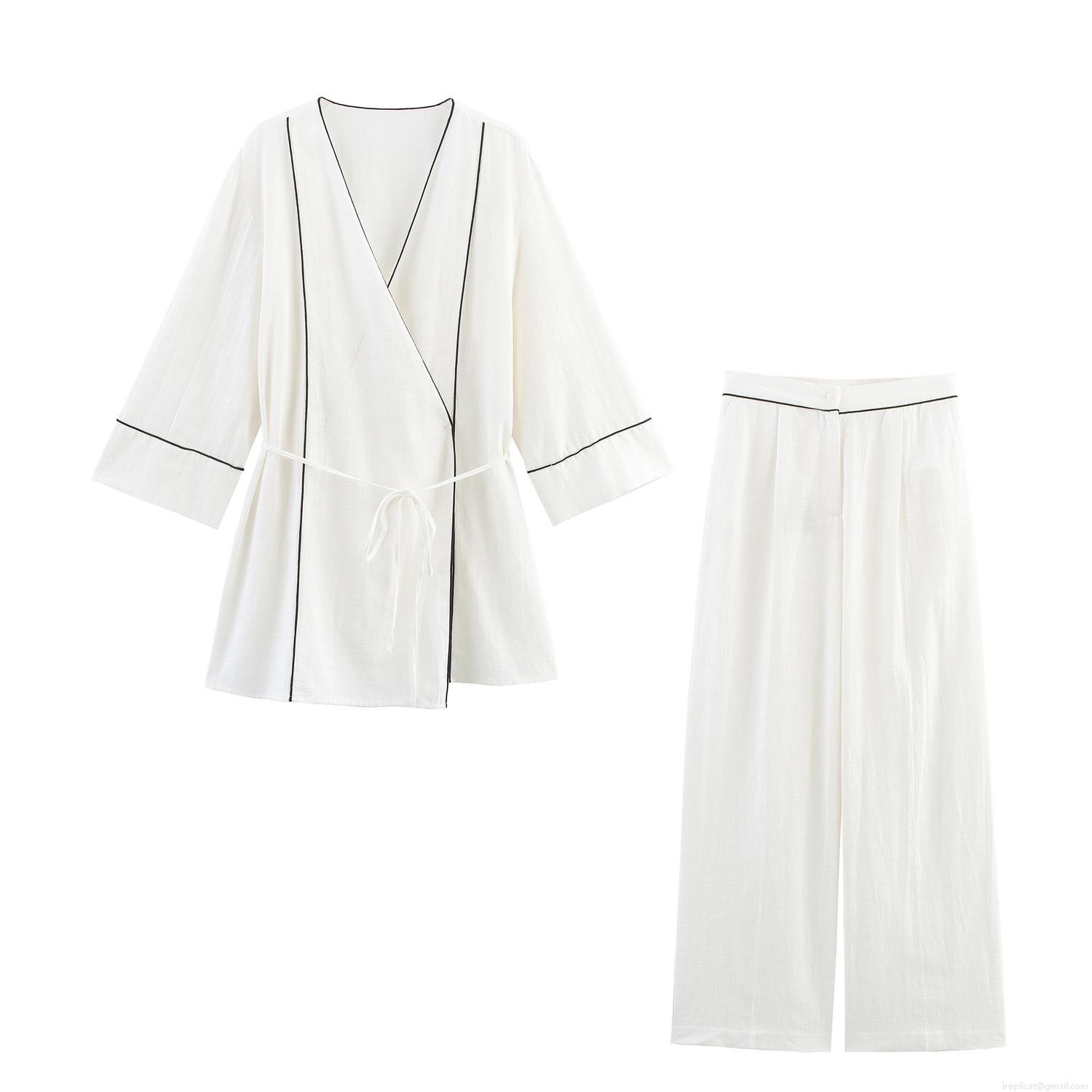 • Women's Pajama Set Contrast Piping V Neck Kimono Top Wide Leg Pants Two Piece Loungewear Casual Elegant Polyester Sets For Lady