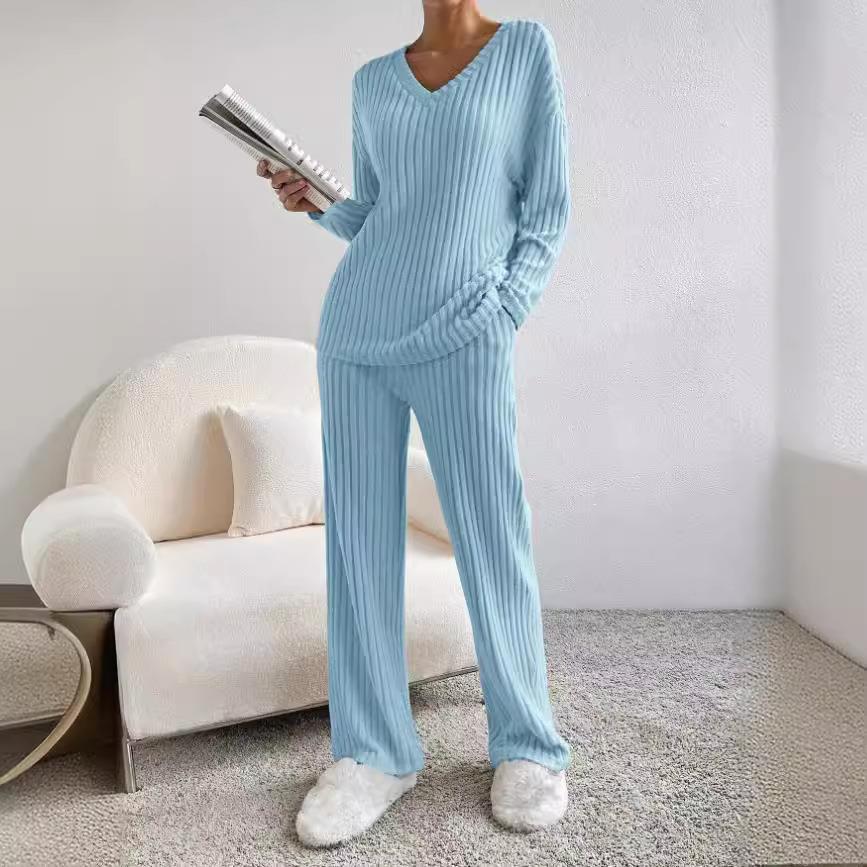 uper soft ribbed knit loungewear set! The loose V-neck long sleeve top and wide leg pants offer great comfort for fall and winter daily wear. Soft, stretchy, and relaxed fit with a simple stylish look. Only minor issue is slight shrinkage after washing, but overall very cozy and worth buying!