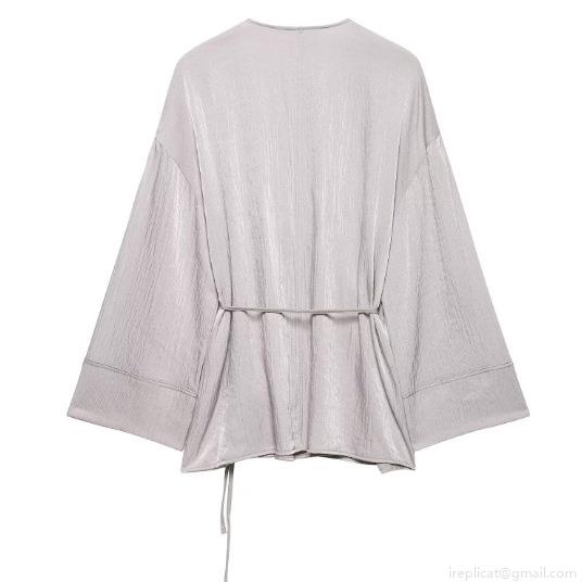 • Women's Silver Grey Satin Pleated Two Piece Set Long Sleeve Kimono Wrap Top And Wide Leg Pants Casual Loungewear Pajama Outfit For Streetwear