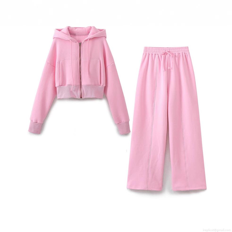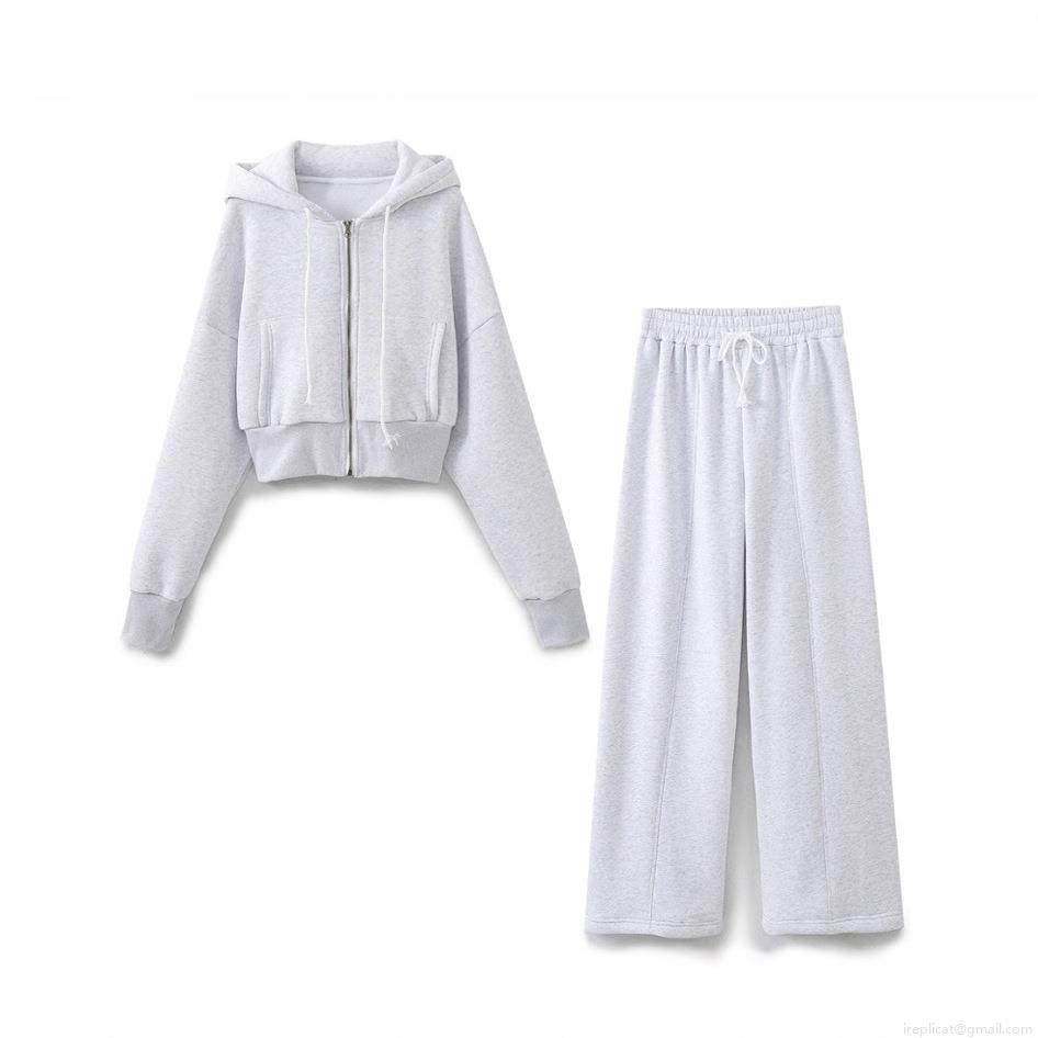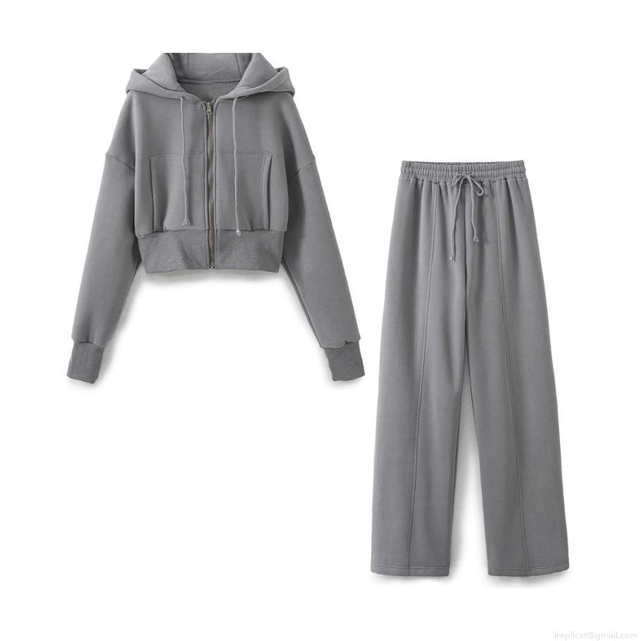 • Women's Sporty Casual Short Hooded Zipper Sweatshirt And High Waist Wide Leg Pants Set Cotton Polyester Blend Lounge Tracksuit Activewear
