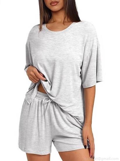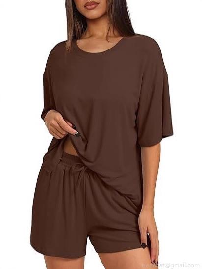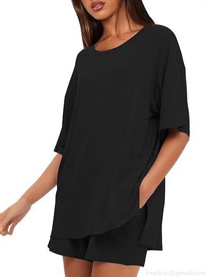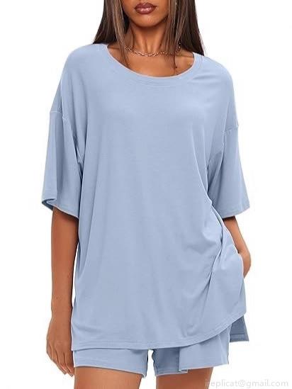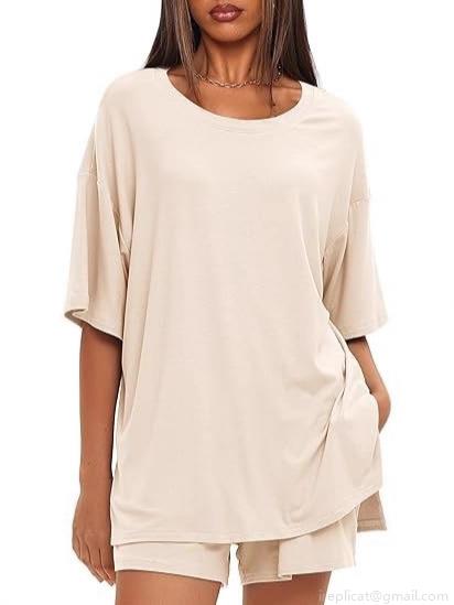 • Women's Summer Casual Loungewear Set Polyester Spandex Oversized Short Sleeve T-Shirt And Drawstring Shorts Two-Piece Set Solid Color Round Neck Home Wear