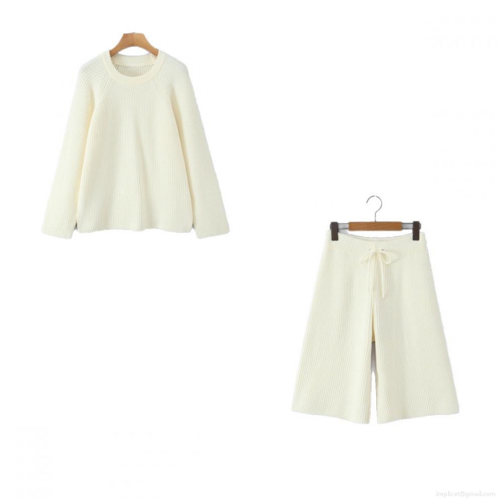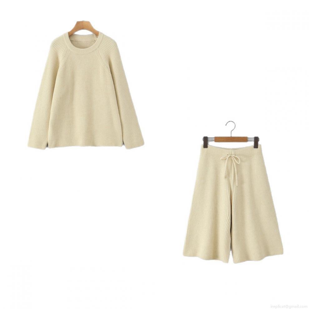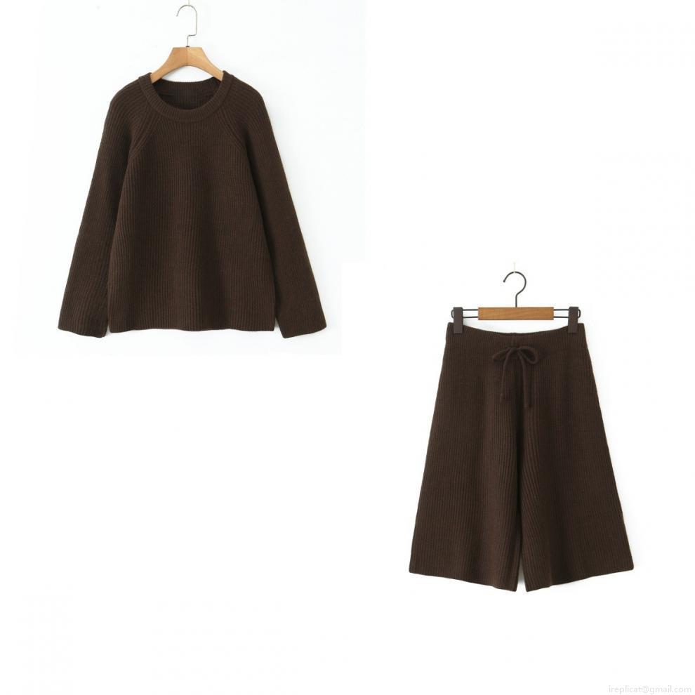 • Women's Two Piece Knit Set Solid Color Round Neck Pullover Long Sleeve Sweater and Wide Leg Drawstring Shorts Casual Loungewear Outfit Streetwear