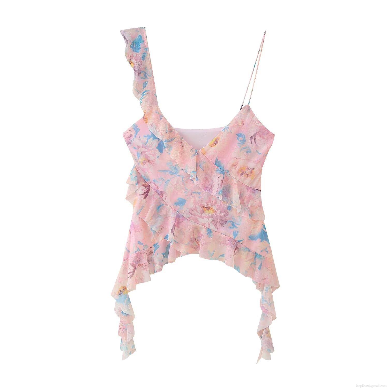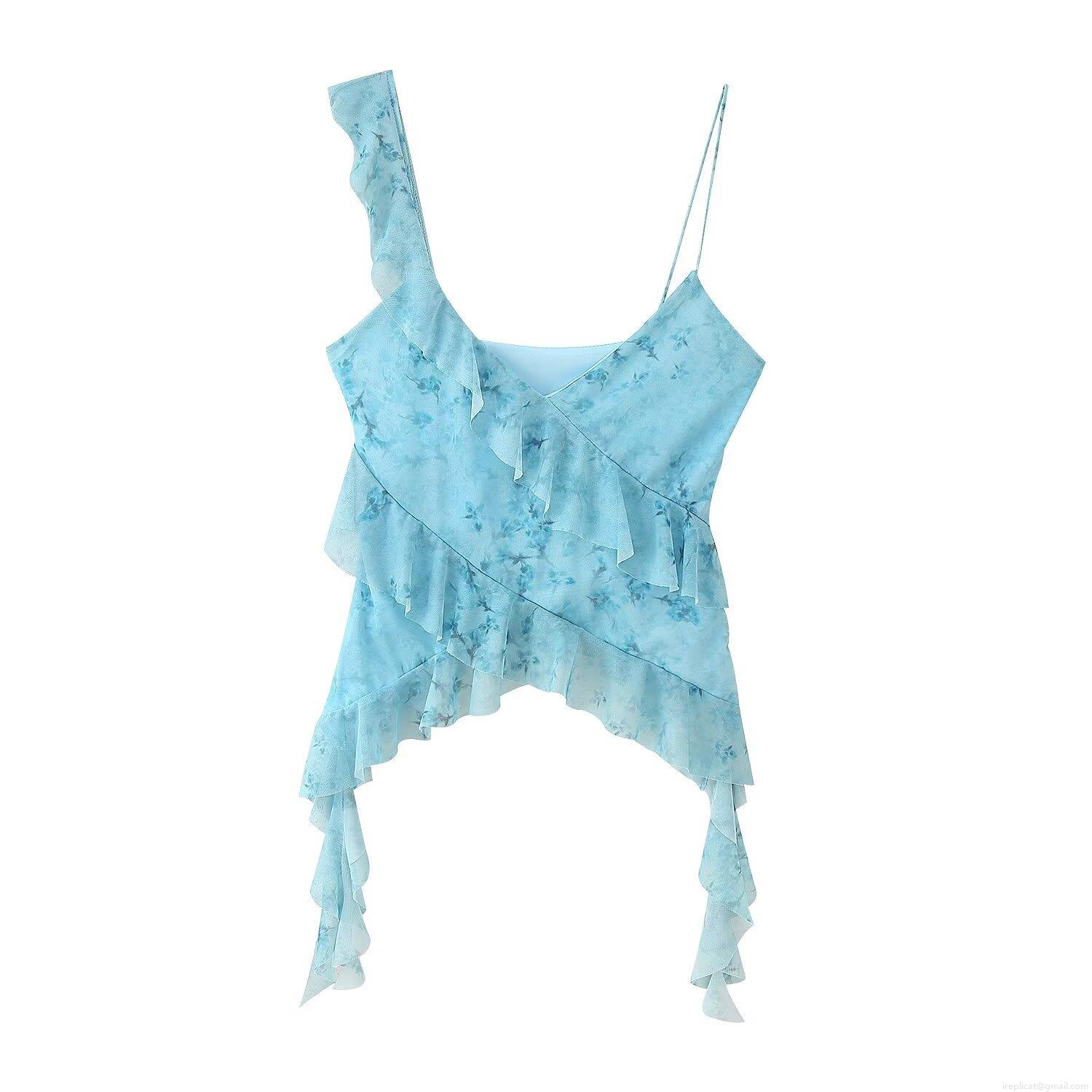 • Women's Mesh Ruffle Camisole Floral Leopard Print Asymmetric Hem Tank Top Sexy Slim Fit Sleeveless Crop Top For Summer Vacation Celebrity Style